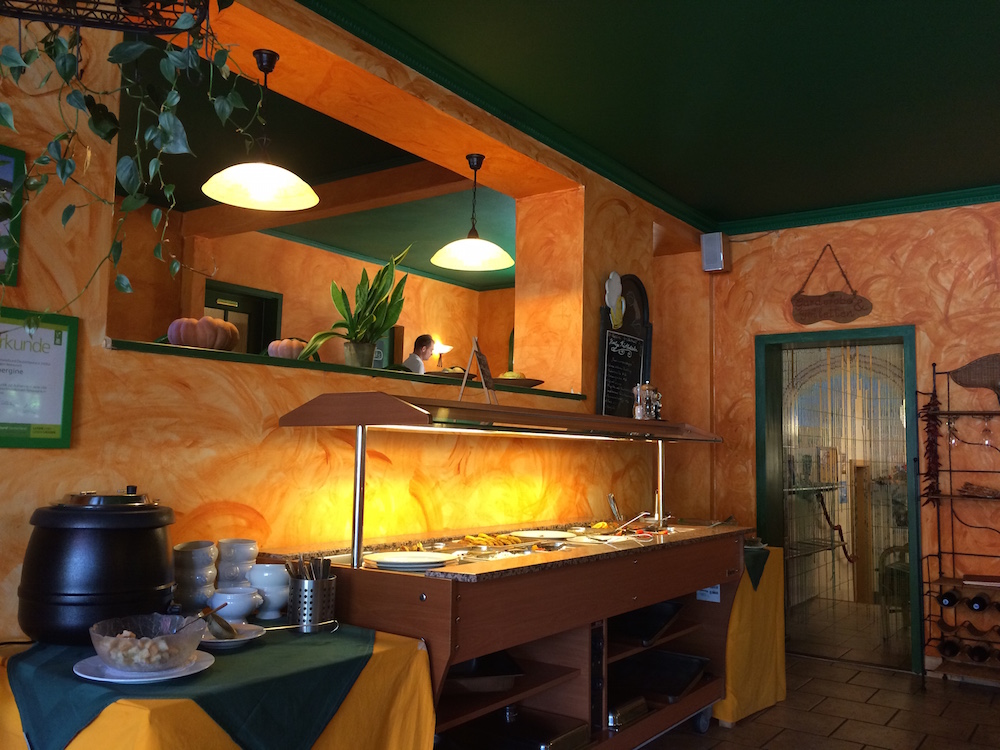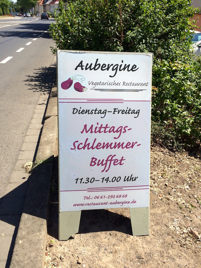 Ich muss gestehen, dass ich fast immer das all-you-can-eat “Mittags-Schlemmer-Buffet” für €10,80 nutze, wenn ich in die Aubergine gehe. (Abends gibt es à la carte.) Neben dem Buffet hängt eine Tafel, auf der klar markiert ist, welche Gerichte vegan sind. Wenn man im Voraus anruft und sich als Veganer ankündigt, gibt es noch mehr vegane Speisen. Dieses Angebot habe ich bisher noch nicht in Anspruch genommen, und dennoch wurde ich bisher nie von der vorhandenen veganen Vielfalt enttäuscht.