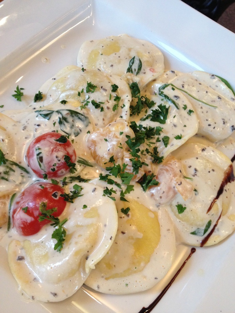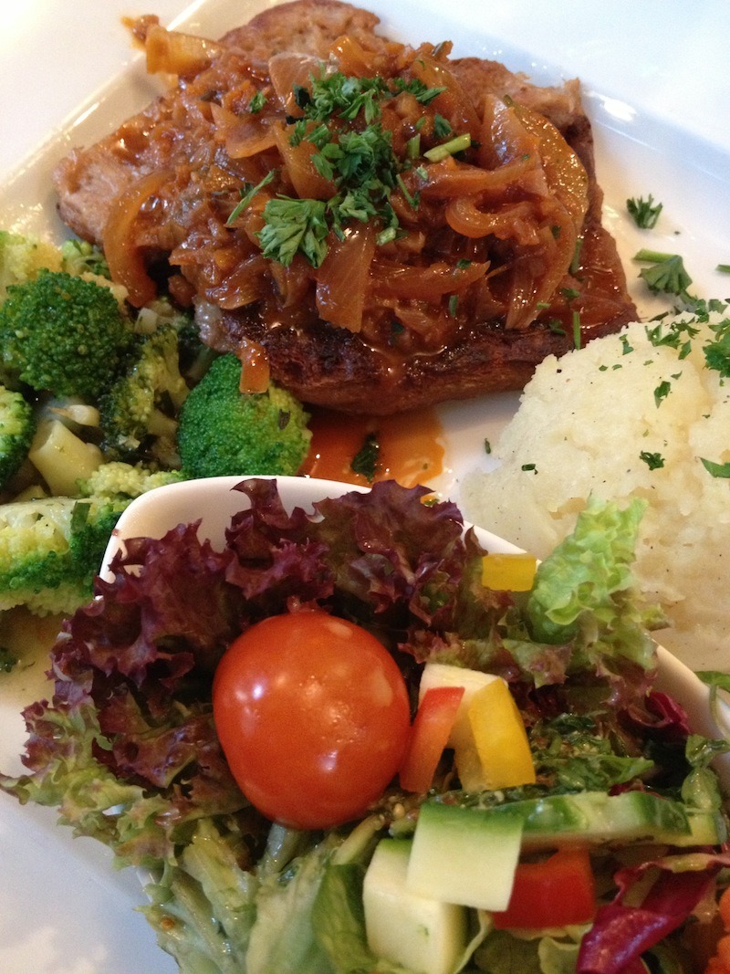 Wir hatten Trüffelravioli, Käse-Spätzle und einen Rostbraten mit Kartoffelpüree und Brokkoli. Die ersten beiden Gerichte stießen bei allen Beteiligten auf Begeisterung, vor allem die Ravioli waren superlecker, aber auch die Käsespätzle schmeckten toll. Der Zwiebelrostbraten – für immerhin 17,50 Euro – allerdings war eher enttäuschend. Bei dem „Braten“ handelt es sich ja um ein Soja Big Steak, das man z.B. bei alles-vegetarisch.de für kleines Geld bestellen kann. Das Big Steak ist zunächst mal korktrocken und muss erstmal eingelegt werden, in heißem Wasser und einer Würzmischung – und zwar sehr lange, denn sonst passiert das, was mir beim Steak im Max Pett widerfuhr: es war größtenteils recht zäh und an dem einen Ende noch fast unkaubar hart. Das hab ich z.B. im Zest in Leipzig deutlich besser serviert bekommen. Fand ich angesichts des Preises, der mir für die günstigen Zutaten eh ehrlich gesagt sehr hoch erschien, nicht so dolle. Kartoffelpüree und Brokkoli waren lecker, aber auch keine Offenbarung.