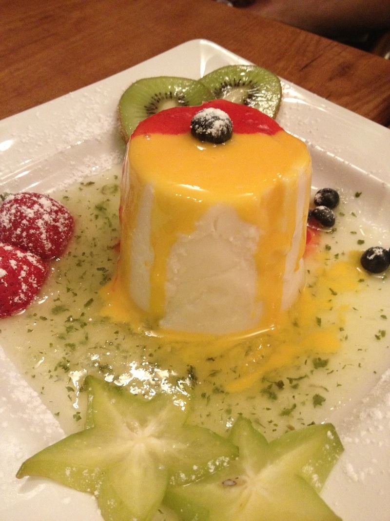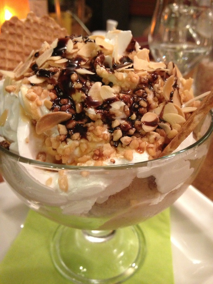 Dafür begeisterten die Desserts wieder umso mehr. Zitronen Panna Cotta und ein Knusper-Eisbecher wurden geteilt. Den nicht vegan-lebenden Freunden schmeckte die Panna Cotta zwar anders als das „Original“, aber nichtsdestotrotz sehr lecker, vor allem die Kokos-Note wies zu gefallen. Der Knusper-Eisbecher mit hausgemachten Eis (darunter Avocadoeis, sehr interessant und lecker) war großartig, vor allem auch die üppige Sahneportion in Kombination mit den Mandelsplittern und der Schokosauce. Absolut top!