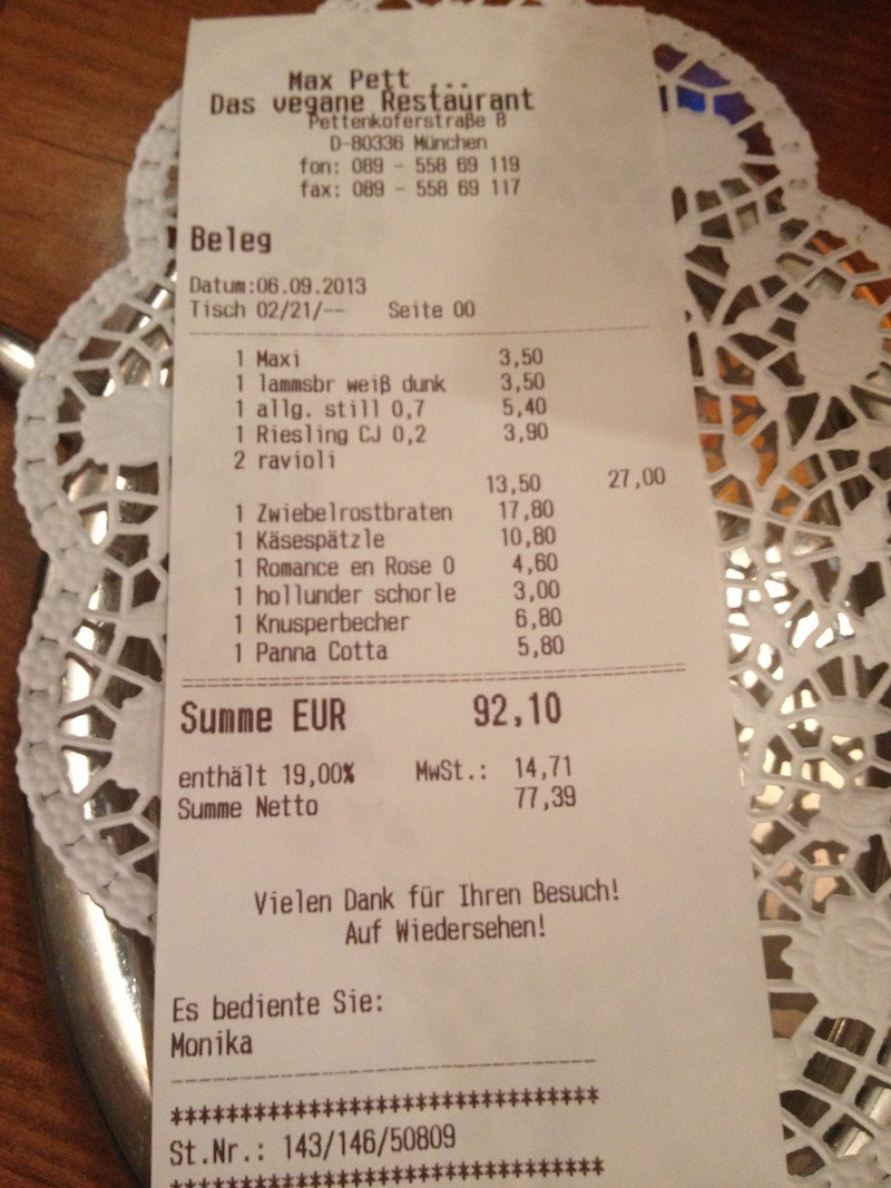 Fragt man Münchener nach ihren Essens-Tipps, so wird ganz sicher das Max Pett unweit des Sendlinger Tors genannt werden, eines der wenigen 100% veganen Restaurants der Stadt. Dazu ein ziemlich schickes. In München sieht die vegane Gastronomielandschaft überhaupt ganz anders aus als in Berlin oder Leipzig, wo Fast Food ziemlich groß geschrieben wird. Hier scheint mehr Wert auf leicht gehobene Küche gelegt zu werden, und Fast Food gibt es allenfalls im Royal Kebab Haus.