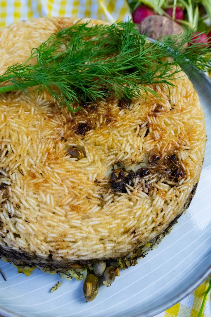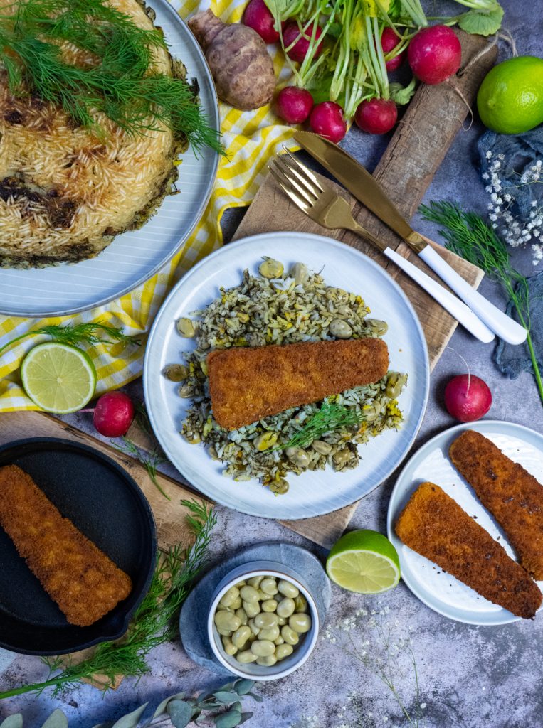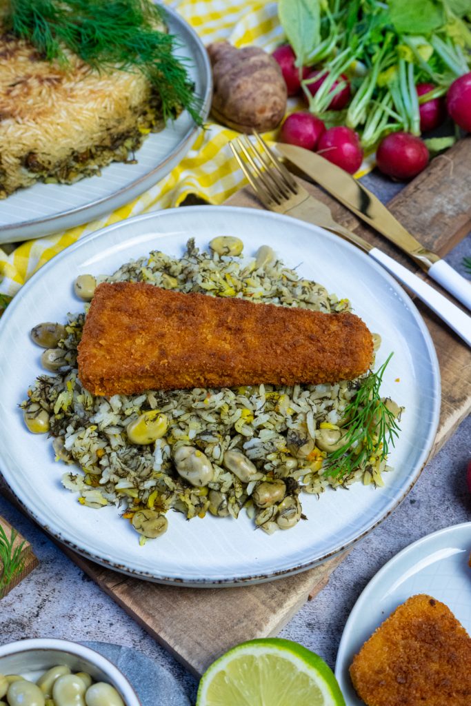 Du kannst den Reis nun als Kuchen servieren oder auf einer Platte verteilen. Parallel kannst du die Veggie Filees zubereiten und sie als Highlight auf dem Reisteller präsentieren. Sieht das Gericht nicht super lecker aus? Lasst uns gemeinsam den Fischen eine Pause gönnen.