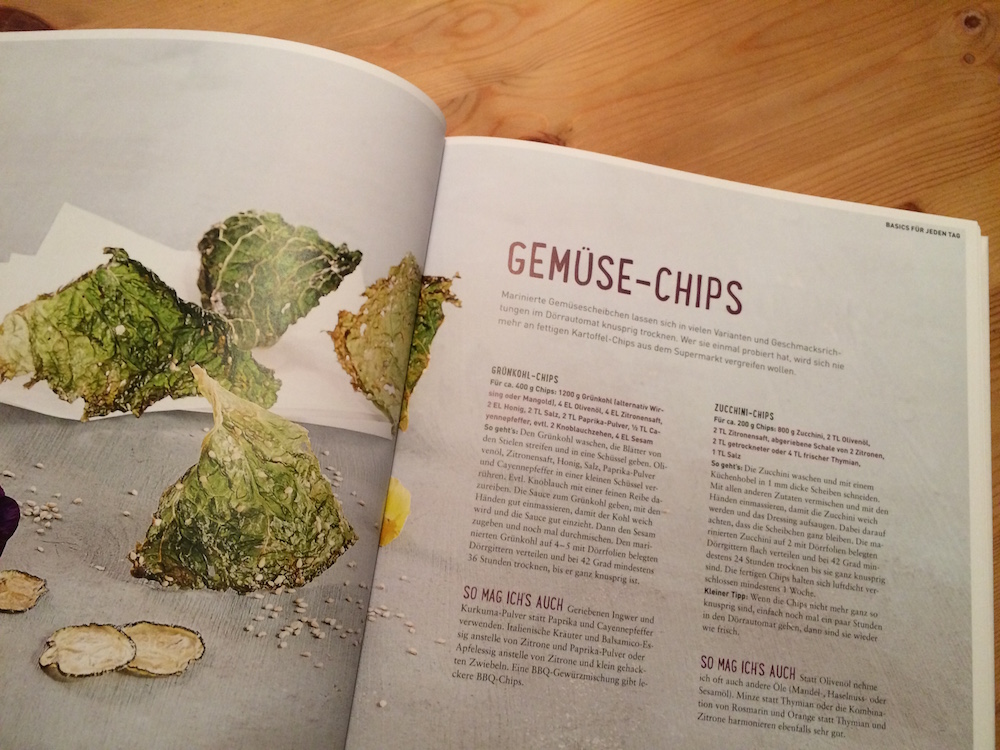 Im Kapitel „Basics für jeden Tag“ gibt es eine Menge Wissenswertes über Grüne Smoothies – die richtige Mischung zum Beispiel, was reingehört und natürlich ein paar Rezepte. Das gleiche für grüne Säfte, also Gemüsesäfte. Weiter geht es mit Salaten und Salatdressings, Toppings und Gemüsechips. Man erfährt, wie das mit dem Fermentieren funktioniert, wenn man z.B. Cashewcreme oder Nusskäse selbst herstellen möchte. Dazu Rezepte für gereiften Nusskäse oder auch Frischkäse.