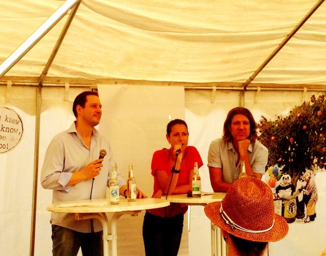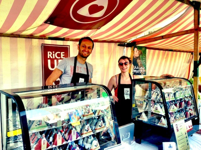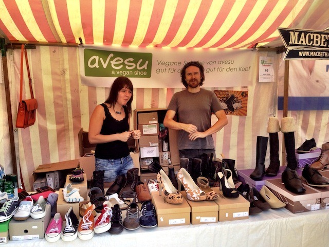 Und los war eine ganze Menge. Natürlich jede Menge zu essen, und besonders vor den Ständen vom Veganz und vom Vego waren die Schlangen extrem lang. Aber auch die Onigiris von Rice up fanden jede Menge Abnehmer, so dass mittags noch mal nachproduziert wurde. Auch lecker: Die Hot Dogs von Vegan Hot Dog und und und….verhungern musste hier keiner, im Gegenteil. Außerdem gab es jede Menge Infostände, z.B. von der Albert-Schweitzer-Stiftung für unsere Umwelt, vom Vebu und vielen weiteren Tierrechtsorganisationen. Aber nicht nur essen und sich informieren konnte man sich, wer ein gutes Buch oder ein schönes Shirt kaufen wollte, konnte dies u.a. beim großen Stand von Roots of Compassion tun, oder sich ein paar Schuhe am Stand von Avesu zulegen. Gewinnen konnte man auch noch jede Menge, und auf die Ohren gab es zusätzlich mit einem tollen Rahmenprogramm. Björn Moschinski kochte auf der Bühne, Notic Nastic rockte die Bühne am Abend und es gab Vorträge und Diskussionen im Vortragszelt, einem der wenigen schattigen Plätze an diesem Tag. Unter anderem sprachen Sonja von Deutschland is(s)t vegan, Rawger Arohma und Christian Härtelt von My Vegan world über die Vorzüge einer rohköstlichen Ernährung.