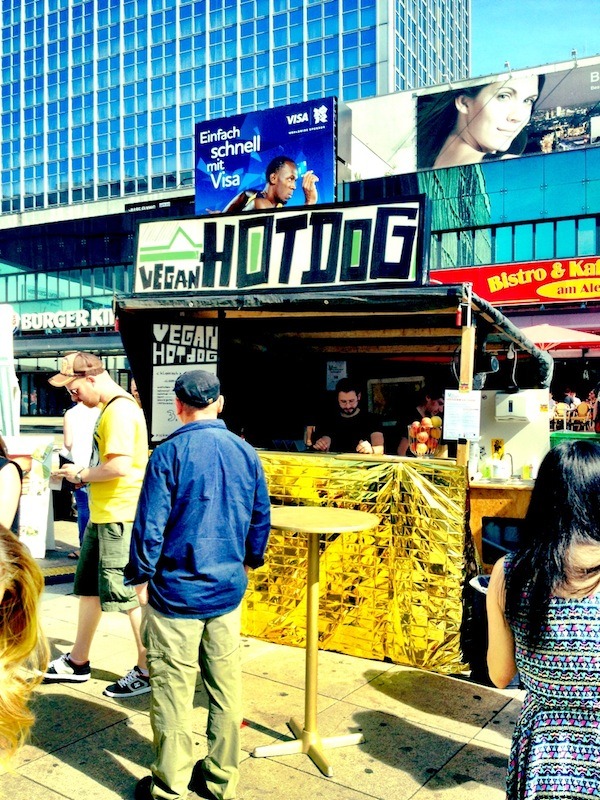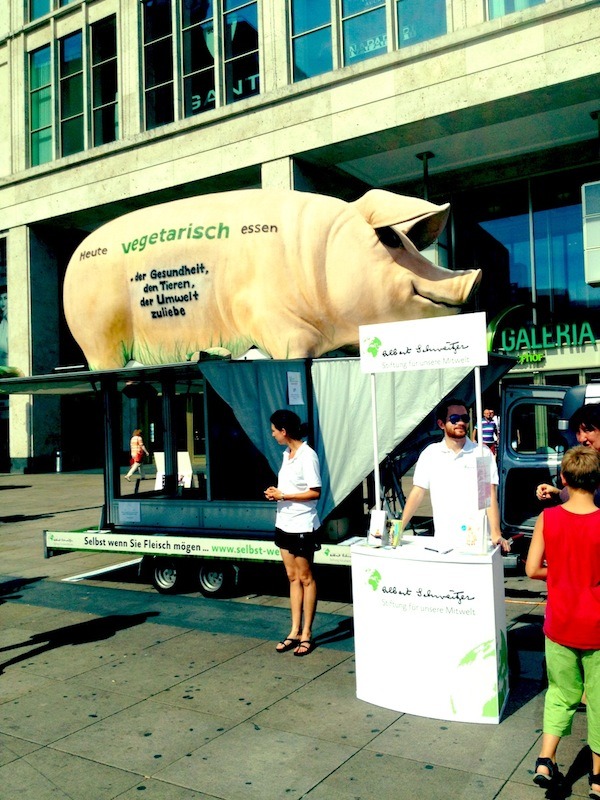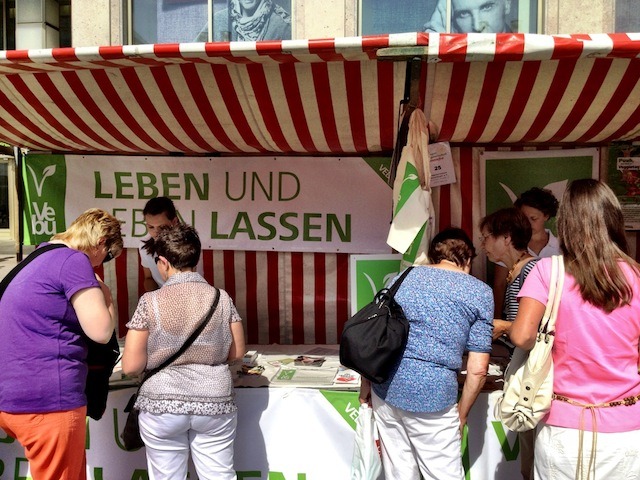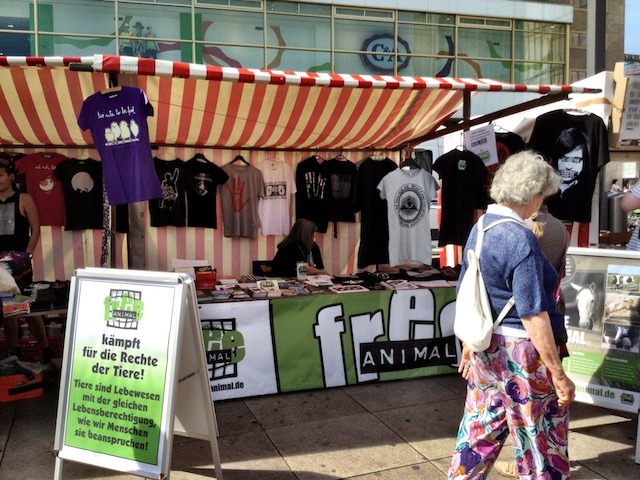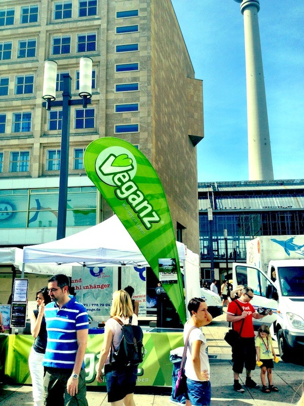 Am 18. August 2012 fand am Alexanderplatz in Berlin das 5. Vegan-Vegetarische Sommerfest statt, und man darf wohl als Beobachter behaupten, dass dies ein voller Erfolg war. Ich weiß nicht, ob es genaue Besucherzahlen gibt (vermutlich überhaupt nicht erhebbar), aber spätestens ab mittag war richtig viel los auf dem Sommerfest. Und seinen Namen trug es diesmal zu Recht: Die Sonne knallte unbarmherzig auf die Besucher. Vielen von diesen waren natürlich ganz gezielt zum Sommerfest gekommen, aber es trieben sich auch eine ganze Menge Passanten interessiert bei den Ständen rum, die wohl aus ganz anderen Gründen oder mit anderen Zielen den Alexanderplatz überquert und sich gewundert hatten, was da so los ist.