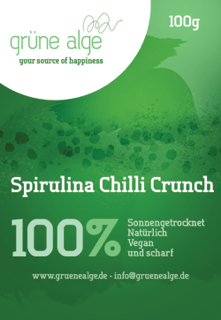 Das schreiben die Betreiber von Grüne Alge zum Thema Spirulina. Die von Grüne Alge angebotenen Spirulina-Produkte kann man in den Varianten „Spirulina Crunchy Flakes“, „Spirulina Chilli Crunch“ und „Spirulina Pulver“ erstehen. Ich kannte Spirulina bislang nur in Tablettenform, fand das daher ganz interessant, in welchen Variationen man das ganze außerdem findet.