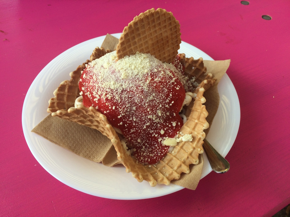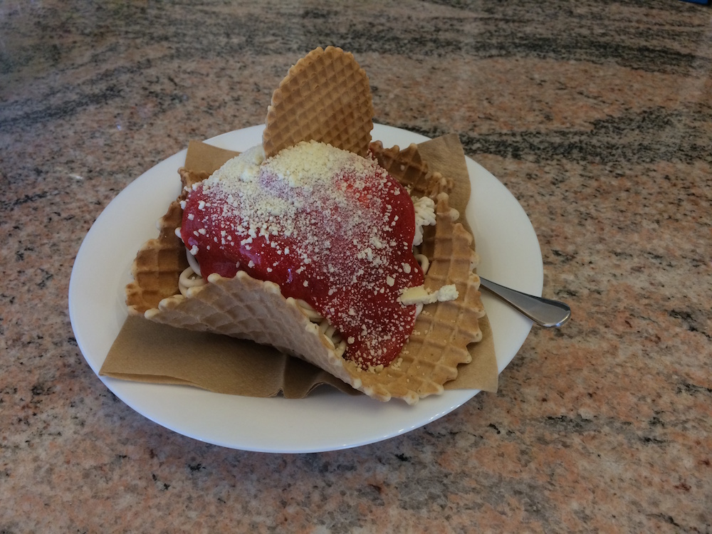 Natürlich sind auch die Eiswaffeln vegan. Richtig, richtig köstlich fand ich auch das besagte Spaghetti-Eis, das in einer wahnsinnig leckeren selbstgemachten Waffel serviert wurde. Auch die Eis-Saucen werden selber gemacht, wie überhaupt so gut wie alles (mit Ausnahme der Standard-Eiswaffeln, weil der Aufwand zu groß wäre). Belgische Waffel-Gelüste werden auch sehr gerne erfüllt, und natürlich gibt es auch sowohl kalte als auch heiße Getränke. Und es gibt vegane Donuts! Die werden dann auch gleich in Eisbechern verarbeitet, abgefahren. Und wer den Eis-Klassiker Banana Split vermisst hat, wird sich freuen, dass es den hier als Hannah Banana.