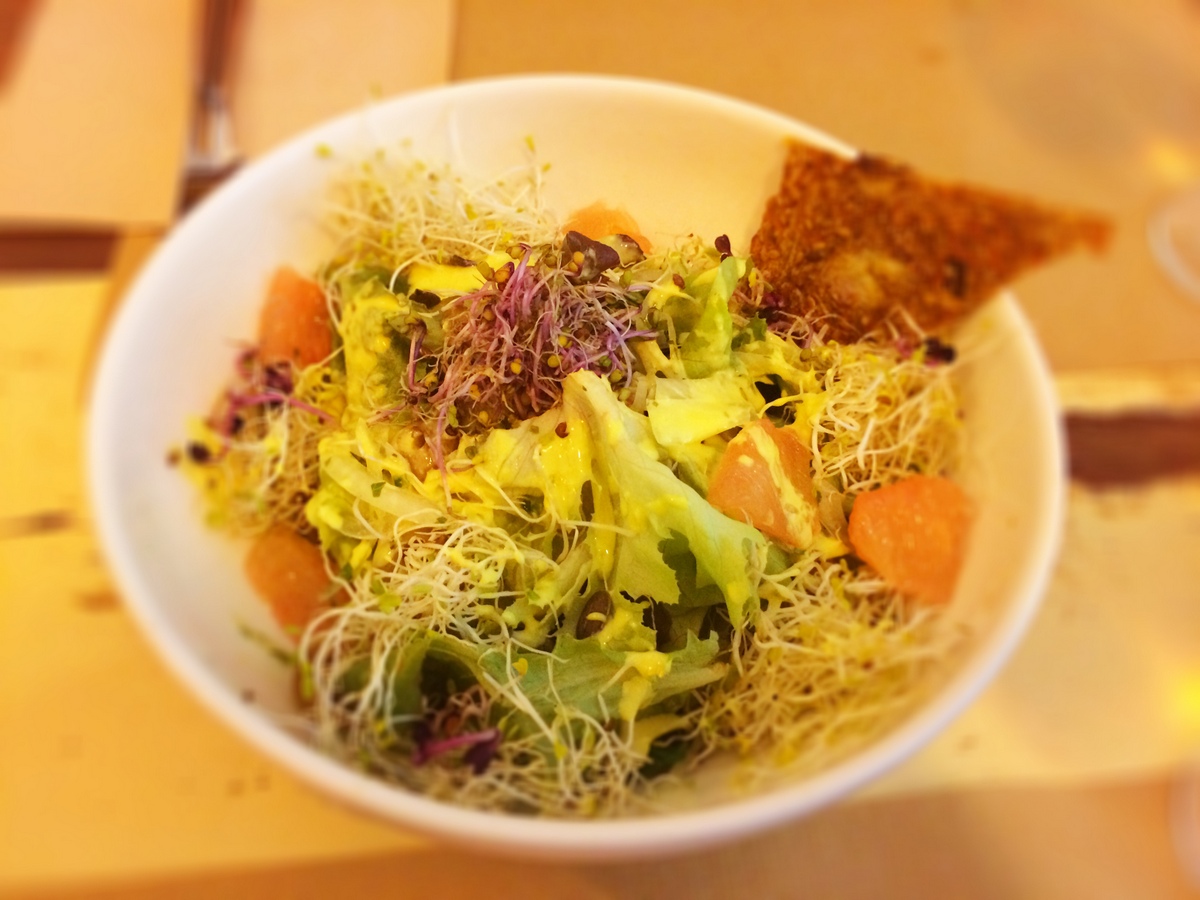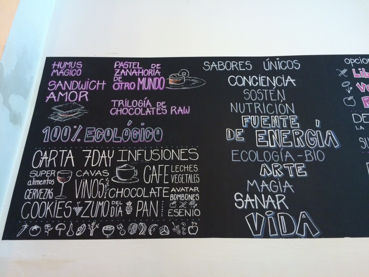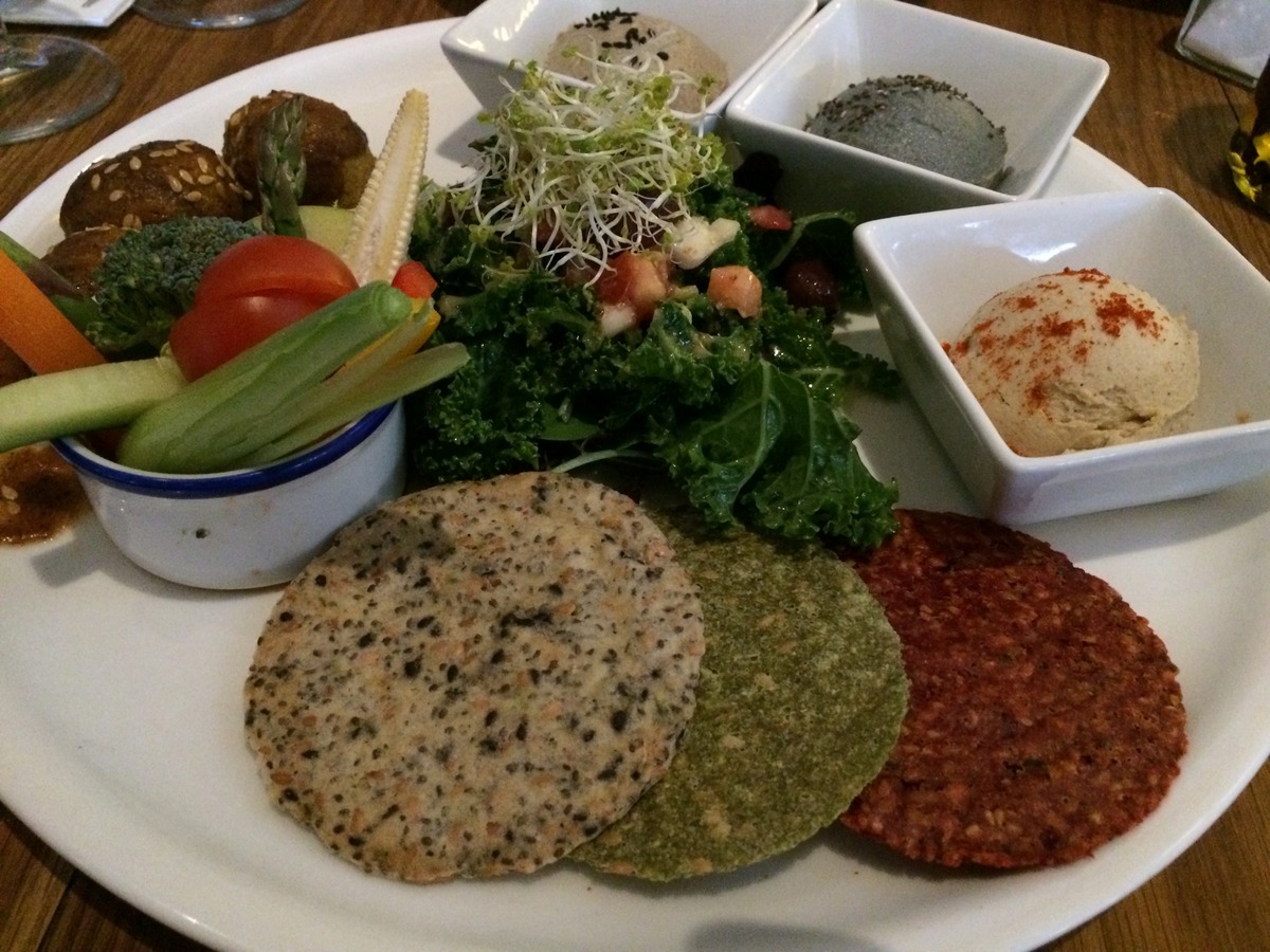 Ein weiterer Favorit ist das „Flax and Kale“ im trendigen Stadtteil Raval, und auch hier zitier ich der Einfachheit halber nochmal mich selbst: „Das Flax & Kale liegt im Trendbezirk El Raval, und hat erst vor einigen Wochen eröffnet. Von außen ist nur zu erkennen, dass der Laden ziemlich groß ist, das gastronomische Konzept aber bleibt zunächst mal unklar. Gut dass wir eingetreten sind, denn Flax & Kale bietet ein ungewöhnliches Konzept, das auf den 4 Säulen “roh”, “glutenfrei”, “vegan” und “Fisch”. Somit bietet der riesige, hochprofessionelle und stylishe Laden zwar nicht 100% vegane Küche, aber schätzungsweise mindestens die Hälfte der Gerichte kommen in Frage, und das sind eine Menge. Die Qualität der Speisen ist auf ganz hohem Niveau, wir waren absolut begeistert. Später abends sollte man unbedingt einen Tisch reservieren, denn der Laden wird trotz seiner Größe (schon mal mit dem Aufzug zur Toilette gefahren?) richtig voll. Das Fax & Kale richtet sich an die sogenannten Flexitarier, also Menschen, die sich hauptsächlich vegan oder vegetarisch ernähren, aber gelegentliche Ausnahmen machen. Und mit diesem Konzept hat man offenbar den Nerv der Zeit getroffen. Eine Besonderheit ist außerdem das Smoothie-Angebot im Flax & Kale, das riesig und kreativ ist. Wer mag, kann sich auch einfach im Eingangsbereich des Ladens einen Smoothie aus den Kühltheken nehmen, z.B. einen “Vegan Vampire”. Die Preise sind hier wenig überraschend auch etwas höher, aber für einen besonderen Abend völlig in Ordnung.“
