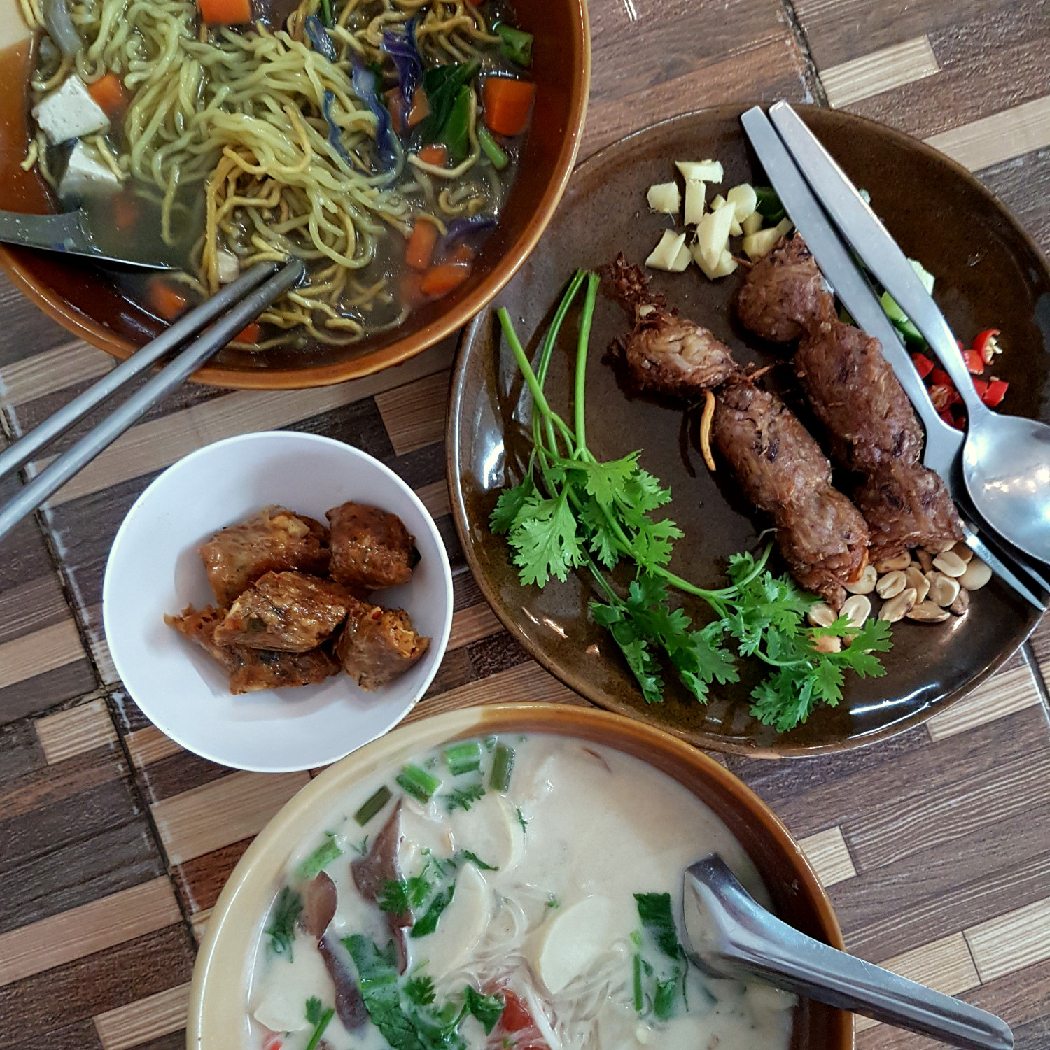 Aber auch im moderneren, östlich gelegenen Stadtgebiet, in dem neue Skytrains, Shopping Malls und Hochhäuser die Gegend zieren, gibt es den ein oder anderen Veggie-Spot. Zum Abendessen eine Top Adresse ist das May Veggie Home. Die Küche hier ist 100% vegan und bietet kreative thailändische Speisen sowie einige westliche Gerichte. Unsere Vorspeise, Enoki Pilze mit veganem Schinken umwickelt, war herzhaft und lecker und auch die Hauptgerichte wussten zu gefallen. Viel frisches Gemüse, oftmals schmackhaft zubereitetes Fake-Meat und aromatische Saucen. Bei Preisen um die 4,00 bis 5,00 Euro pro Hauptspeise gibt es da wirklich nichts zu meckern! Das Restaurant zählt nicht umsonst zu den beliebtesten veganen Locations der Hauptstadt.