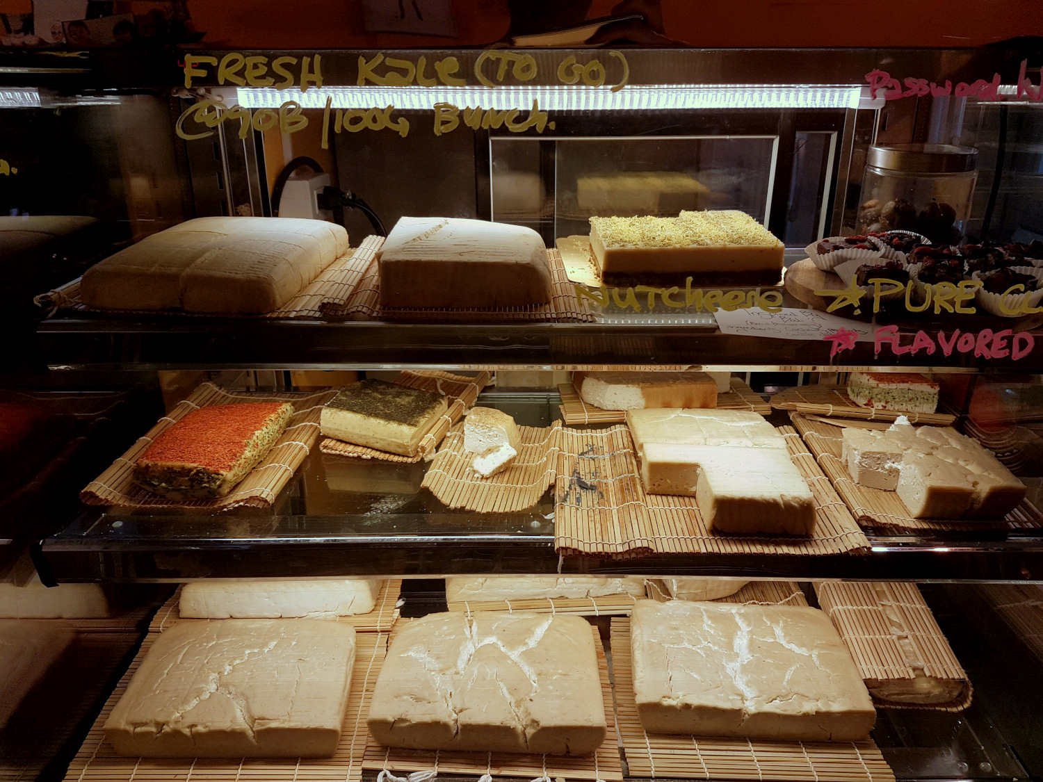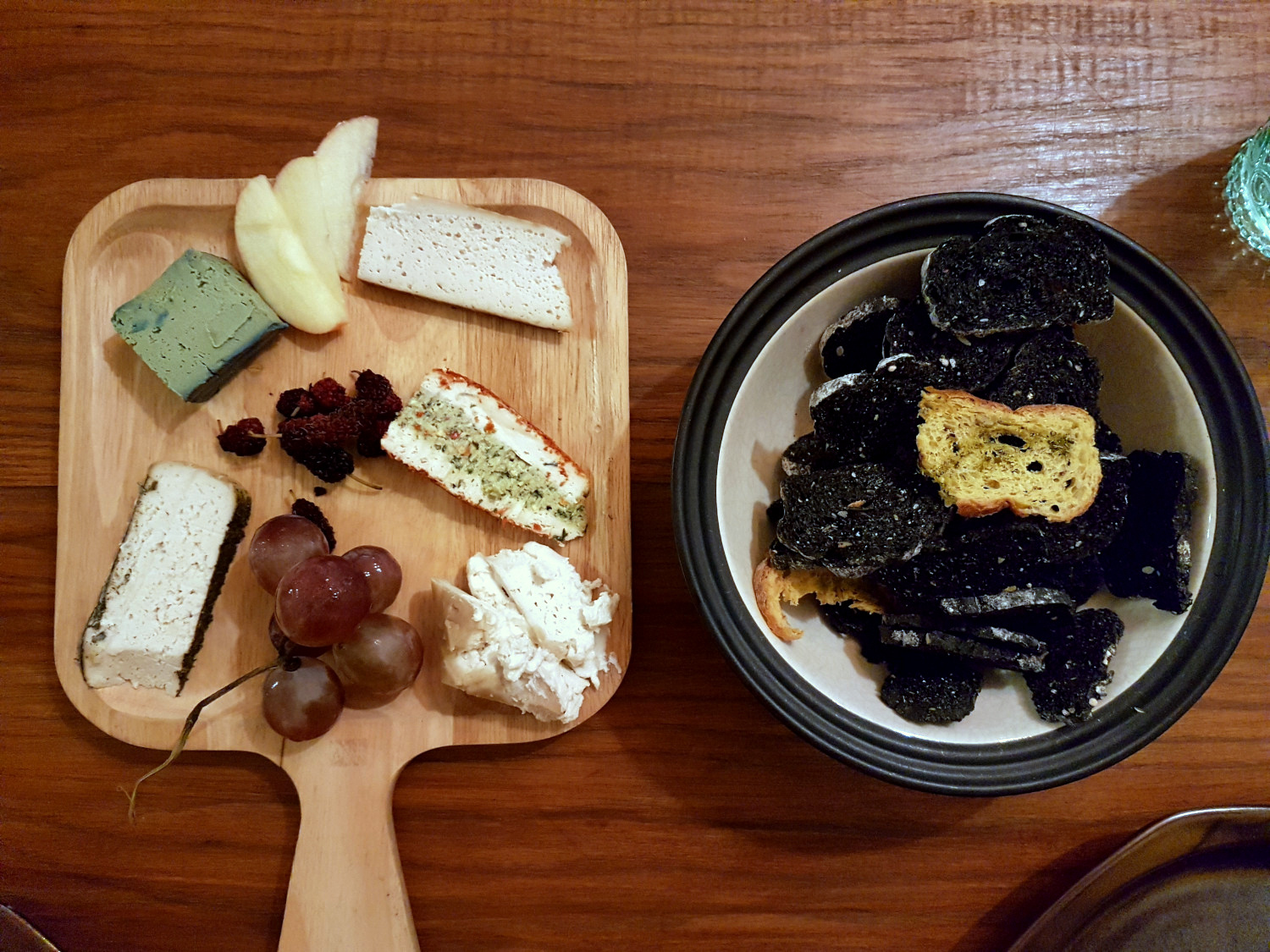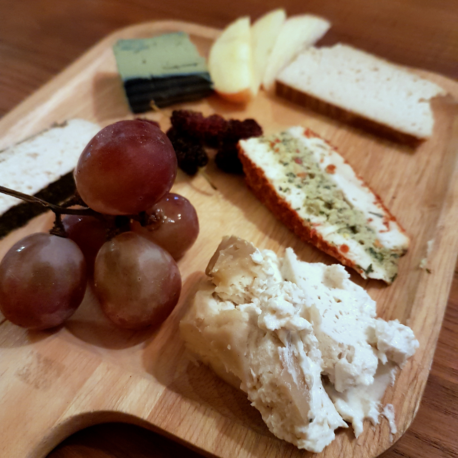 Nun kommen wir aber zu meinem absoluten Highlight in Bangkok. Ebenfalls im Osten der Stadt, im Viertel Sukhumvit, befindet sich das Barefood Bangkok. Und dort gibt es veganen Käse. Richtig viel und richtig guten veganen Käse! Die großen Leiber werden allesamt auf Cashew Basis hergestellt und vor Ort für mehrere Wochen fermentiert. Die gebotenen Sorten reichen von Natur- über Paprika- bis hin zu geräuchertem Käse und sahen schon in der Theke höchst ansprechend aus. Da konnten wir gar nicht anders, als uns eine gemischte Käseplatte zu bestellen. Dazu werden ein paar frische Früchte und hausgemachte Brot-Cracker gereicht. Und was soll ich sagen? Es war super! Jede Sorte hatte ihren eigenen Geschmack und Charakter und der Käse war leider viel zu schnell verputzt. Ich hätte direkt noch eine zweite Portion essen können! Auch schön: gegessen wird hier, gemeinsam mit allen anderen Gästen, an einem großen Holztisch in der Mitte des Raums – da kommt so richtig gemütliches Wohnküchen-Feeling auf.