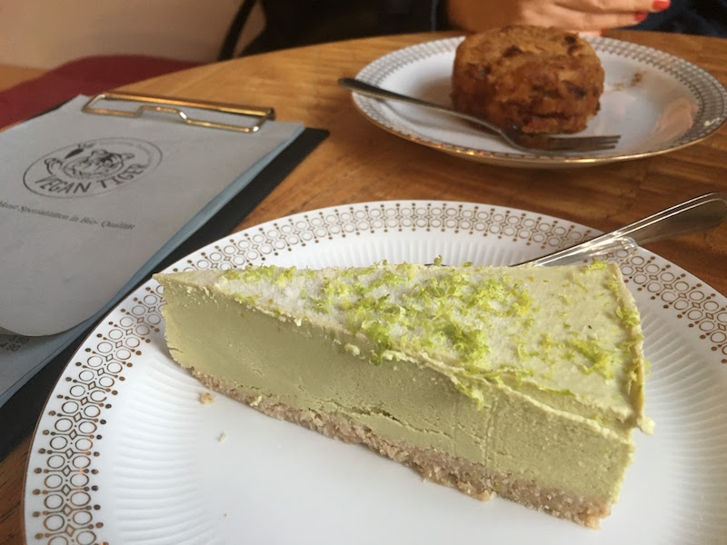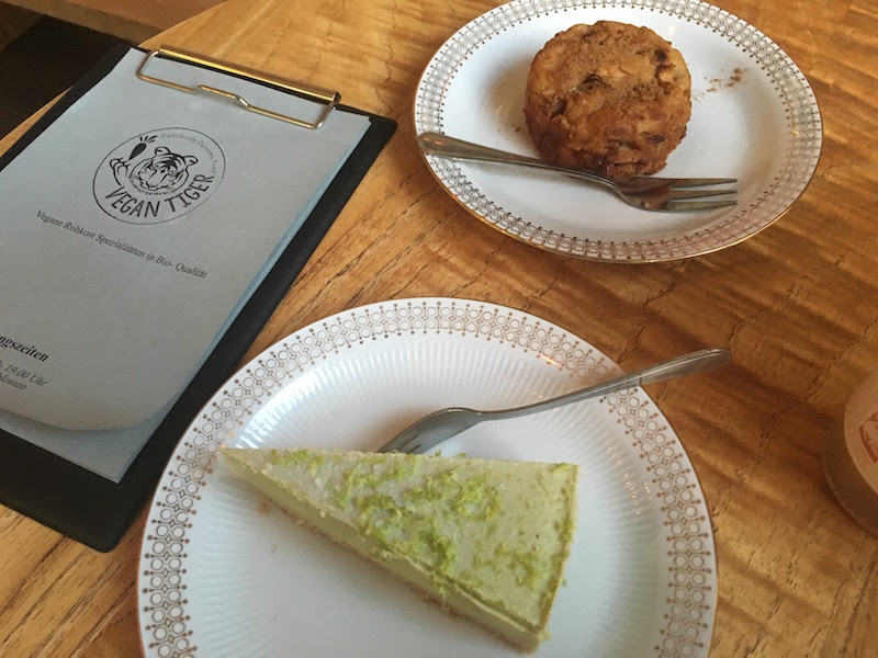 Man kann im Vegan Tiger auf jeden Fall gut frühstücken, z.B. ein Power Porridge, Müsli, belegte Brote, aber auch diverse Grüne Smoothies oder einen Gerstengras Shot. Mittags gibt es Salate, eine reichlich belegte Dinkel-Vollkornstulle, ein Club Sandwich und zum Nachtisch Milchreis. Und wer einfach auf Kaffee und Kuchen Lust hat, bekommt wirklich köstliche Kuchen, teilweise auch rohköstlich. Ich hatte ein Stück Limette-Avocado-Rohkosttorte, und das war ebenso lecker wie das Apfelküchlein meiner Begleiterin. Es gibt auch Mango-Kokos- oder Himbeer-Käse-Kuchen, aber nicht immer sind alle Kuchen vorrätig.