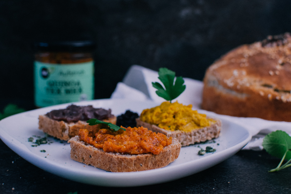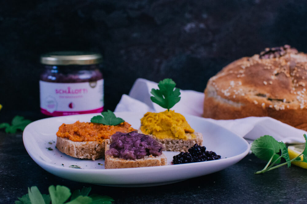 Vegane Aufstriche von Hanfwerk sind in Geschmack, Farbe und Konsistenz auch kein Standardprogramm. Allein die Hauptzutat Hanf spricht für sich. Diese Hanfkrem ist, wie der Name schon sagt: sehr cremig. Die Knoblauchnote ist schon recht üppig – wird aber durch den etwas nussigen Hanfgeschmack angenehm ausgeglichen. Wir finden dazu passt ein verrücktes Brot – wie „Veganes Lila Brot“ aus Sophia Hoffmanns Kochbuch „Vegan Queens„. Erfahrt in unserem Beitrag, wie ihr lila Brot selber machen könnt.