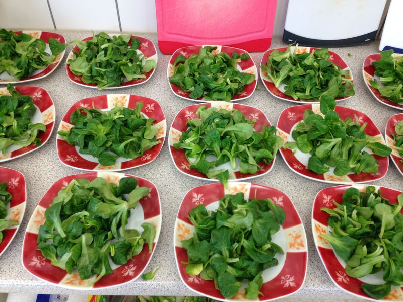 Aber zurück zum Kurs: es wurden 2 verschiedene 3-Gänge-Menüs gekocht, vor allem Gemüsegerichte, aber auch einige Ersatzprodukte vorgestellt. Denn auch, wenn die nicht den Großteil einer veganen Ernährung machen, gehören sie doch irgendwie dazu. An Gemüse gab es gefüllten mediterranen Fenchel an Feldsalat gebratenen Birnen und Walnüssen, Polenta-Auflauf mit mediterranem Gemüse und bei den Ersatzprodukten wurde beispielsweise Speck durch Räuchertofu ersetzt, Gelatine durch Agar-Agar, eine Mousse au Chocolat wurde mit Leha Schlagfix zubereitet und sogar Soja-Rouladen gab es. Eins meiner Highlights war das Orangen-Holunderblüten-Törtchen, so haben die Teilnehmer gleich gezeigt bekomment, dass auch Backen wunderbar ohne Milch, Butter und Eier funktioniert. Alles in allem fand ich die Zusammenstellung der Gerichte sehr gut und insgesamt den Kochkurs wirklich toll. Es lagen auch viele Bücher aus, in die die Teilnehmer ihre Nasen stecken und schmökern konnten.
