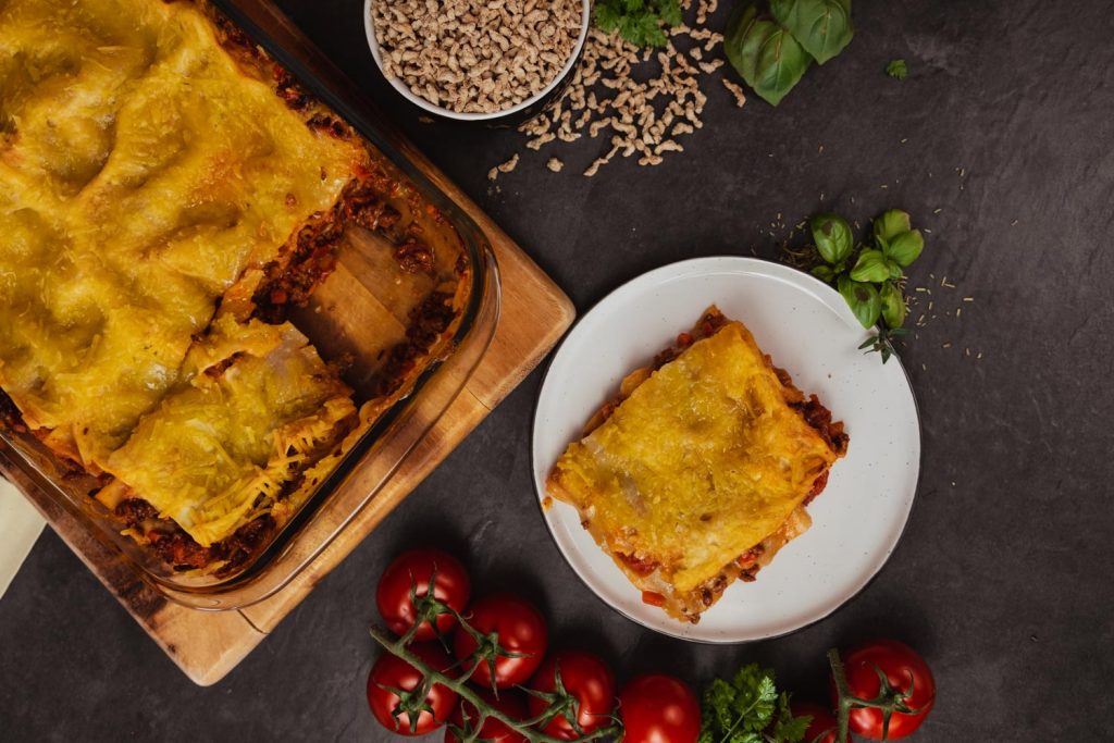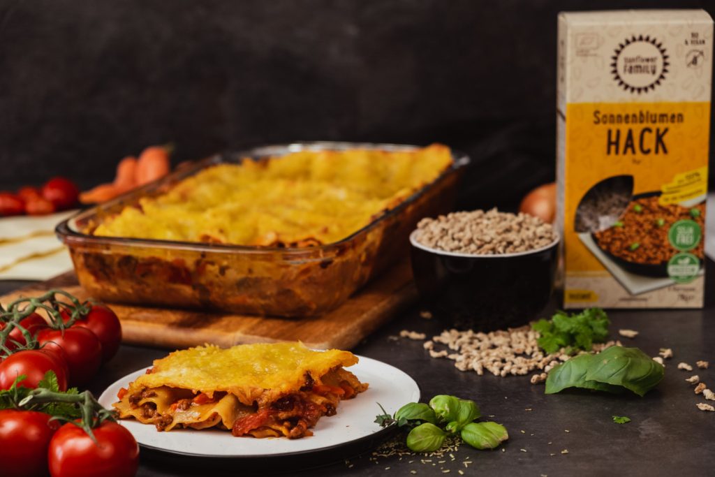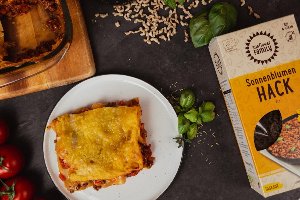 Wir haben mal wieder das Sonnenblumen-Hack von Sunflower genutzt, um ein leckeres Gericht zu zaubern. Letztes Mal haben wir aus dem Sonnenblumen-Hack ein saftiges Burger-Patty zubereitet. Diesmal gibt es Lasagne! Der beliebte italienische Nudelauflauf bietet sich an, wenn man in größerer Runde isst. Lasagne macht satt, schmeckt unfassbar gut und benötigt wenige Zutaten. Mit dem Sonnenblumen-Hack verzichtest du außerdem auf unnötige Geschmacksverstärker, Soja, Weizen und viel Fett. Probier es doch mal aus und sag uns, wie dir die Lasagne geschmeckt hat.