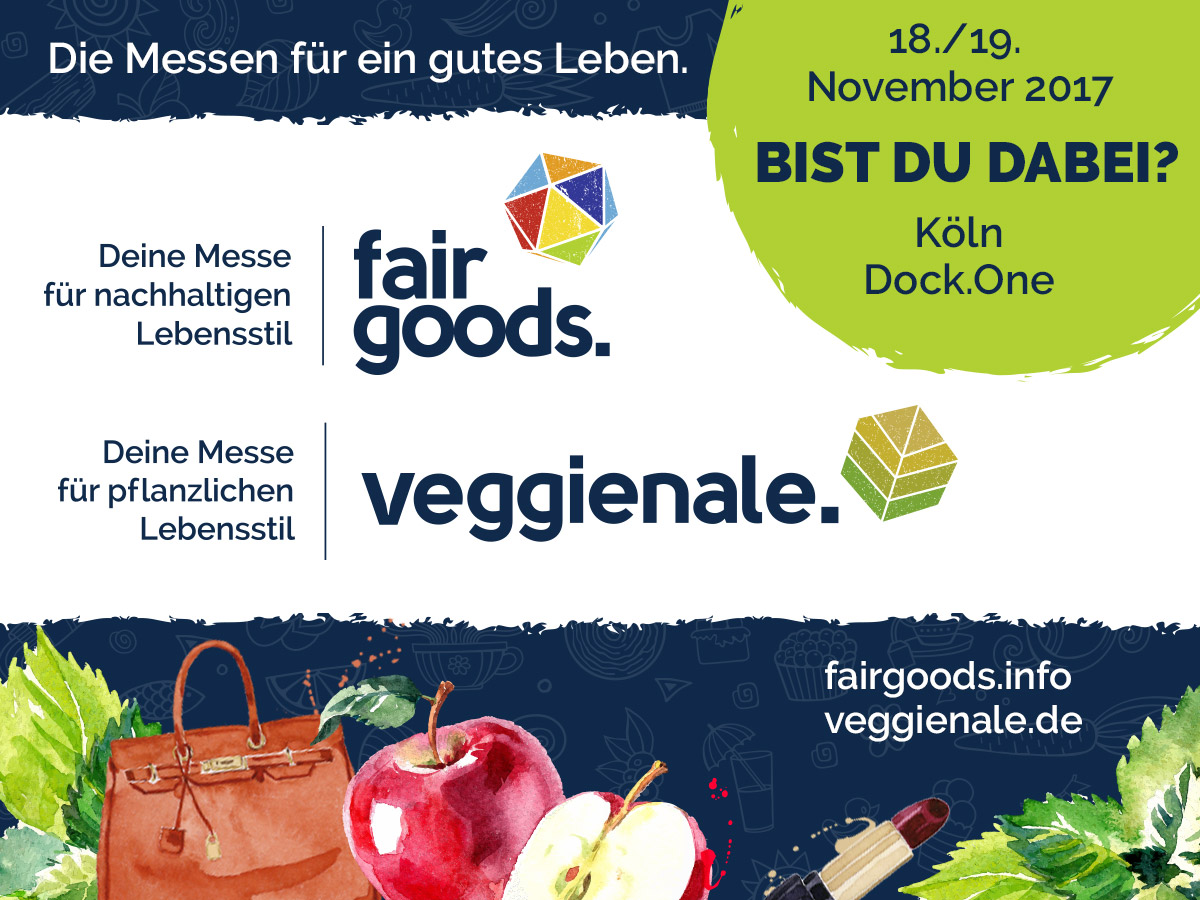 Heute haben wir mal wieder einen Veranstaltungstipp für euch. Bei der Veggienale (und der fairgoods, dazu später mehr) dreht sich alles um um eine ökologische und vegane Lebensweise. Rund 60 Aussteller präsentieren am 18. und 19. November 2017 in Köln jede Menge Angebote aus den Bereichen bio-vegane Lebensmittel, Upcycling, ethische Finanzen, grüne Mode, erneuerbare Energien, gesunde Ernährung u.v.m. Daneben gibt es spannende Vorträge, Workshops, Bühnenshows und Mitmachaktionen rund um die Themen Nachhaltigkeit und Veganismus.