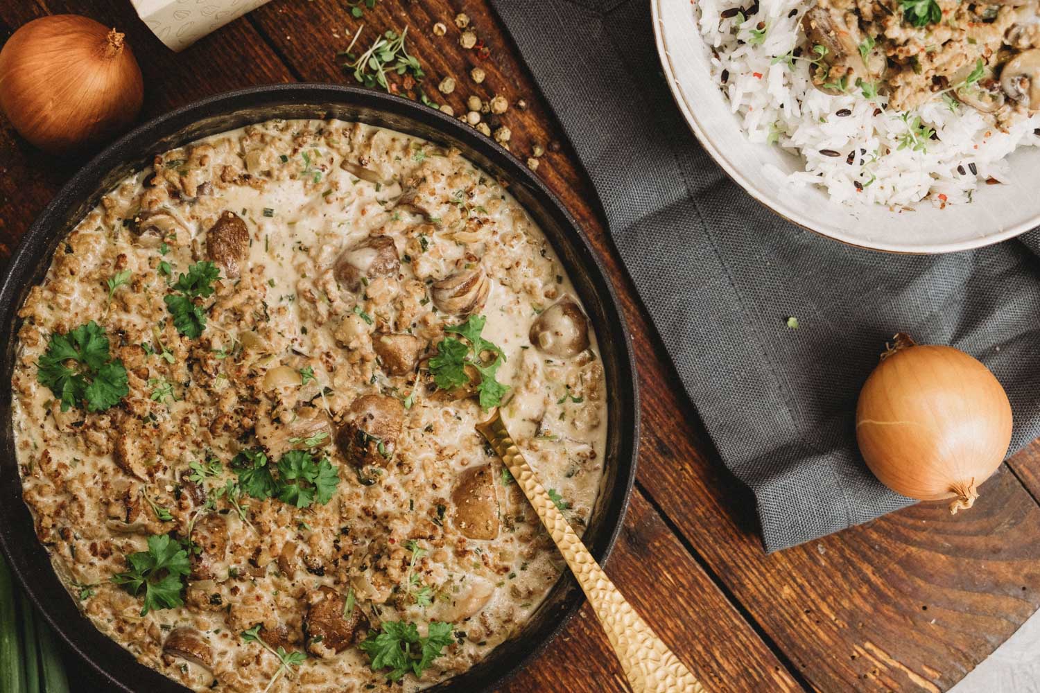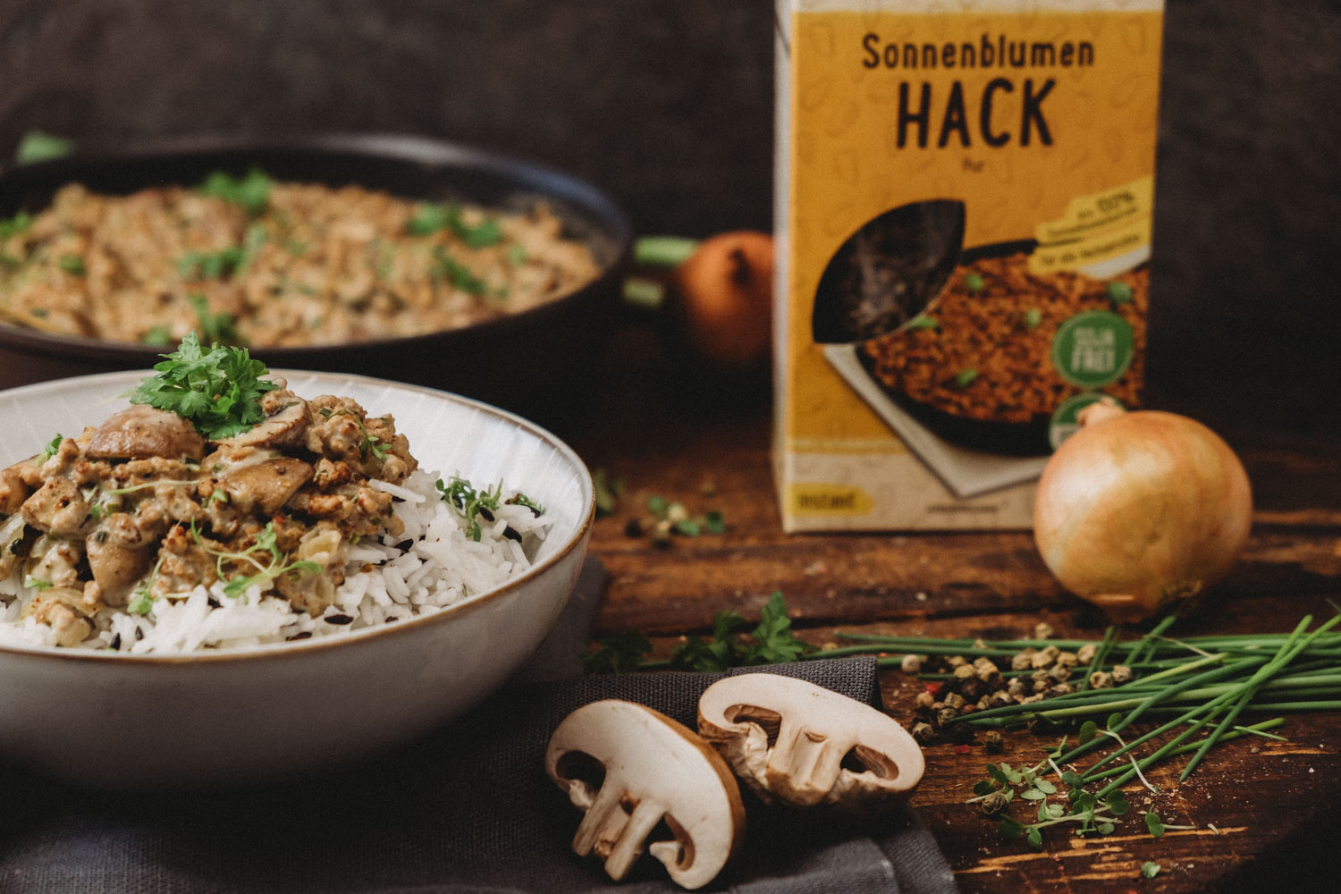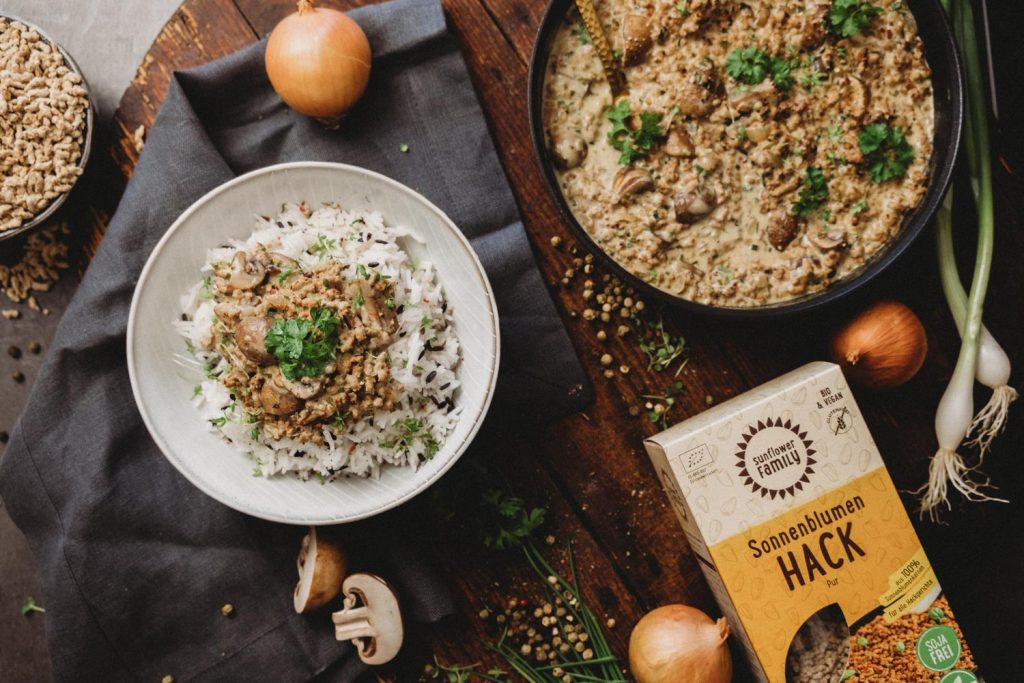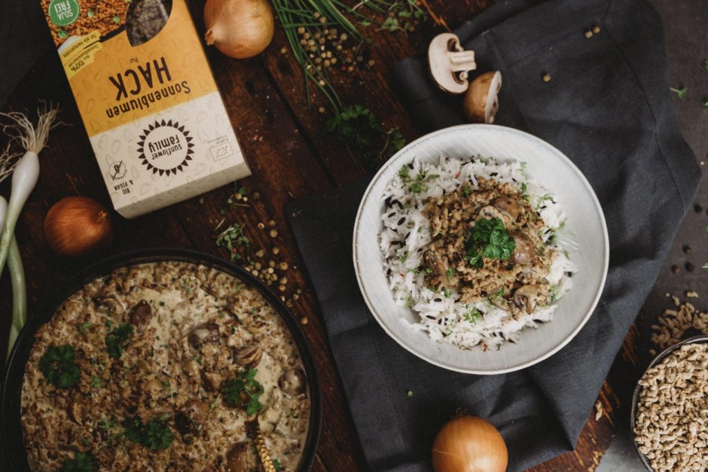 Wir haben mal wieder das Sonnenblumen-Hack von Sunflower genutzt, um ein leckeres Gericht zu zaubern. Bisher haben wir damit unter anderem ein saftiges Burger-Patty und eine herzhaft leckere Lasagne gekocht. Diesmal gibt es eine vegane Pilzpfanne! Egal ob zu Reis, Kartoffeln oder Nudeln – Die Pilzpfanne kannst du zu verschiedenen Beilagen verwenden und sie schmeckt zu jeder Jahreszeit.