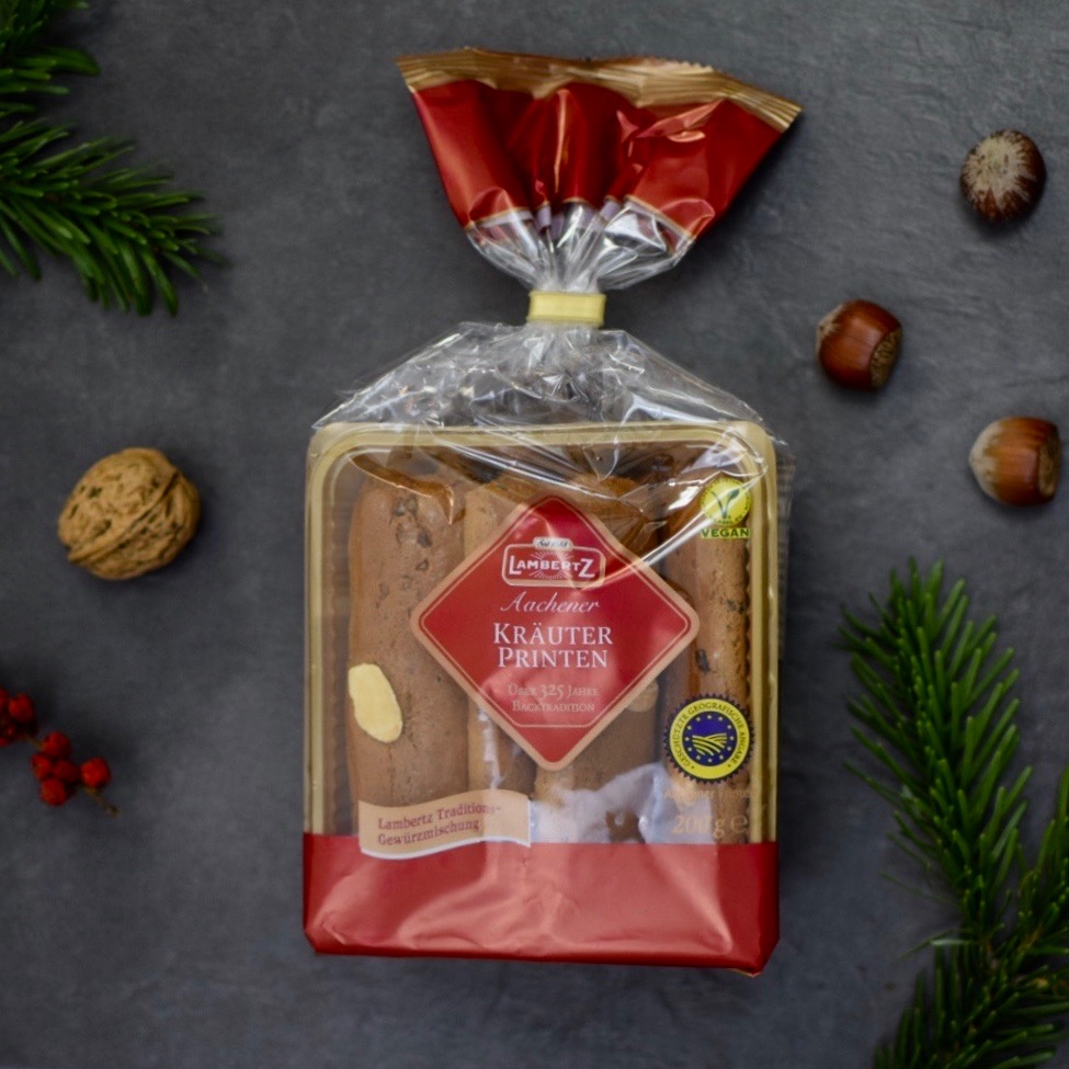 Die klassische „Aachener Printe“, welche nach dem Lambertz Traditionsrezept gebacken wurde, darf sich schon immer vegan nennen. Allerdings macht sie das erst seit diesem Jahr mit dem V-Label auf der Verpackung. Veredelt wird die traditionelle Printe mit einer feinen Glasur und einer Mandel im Inneren.