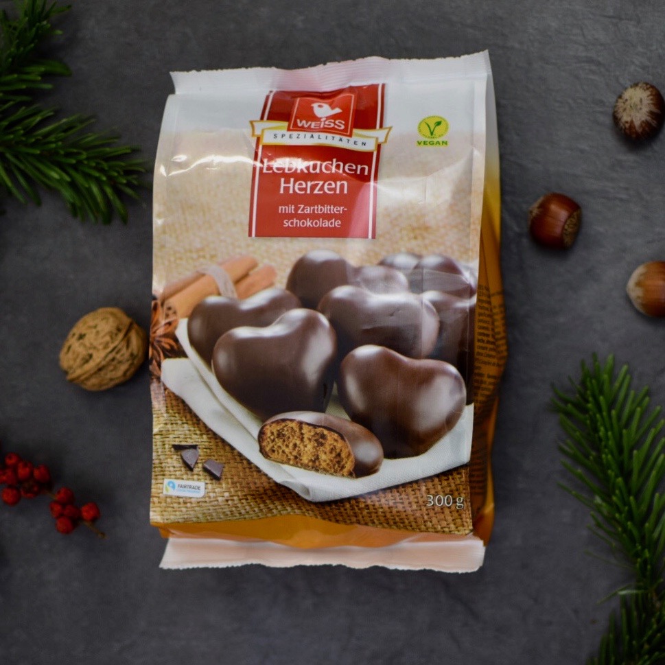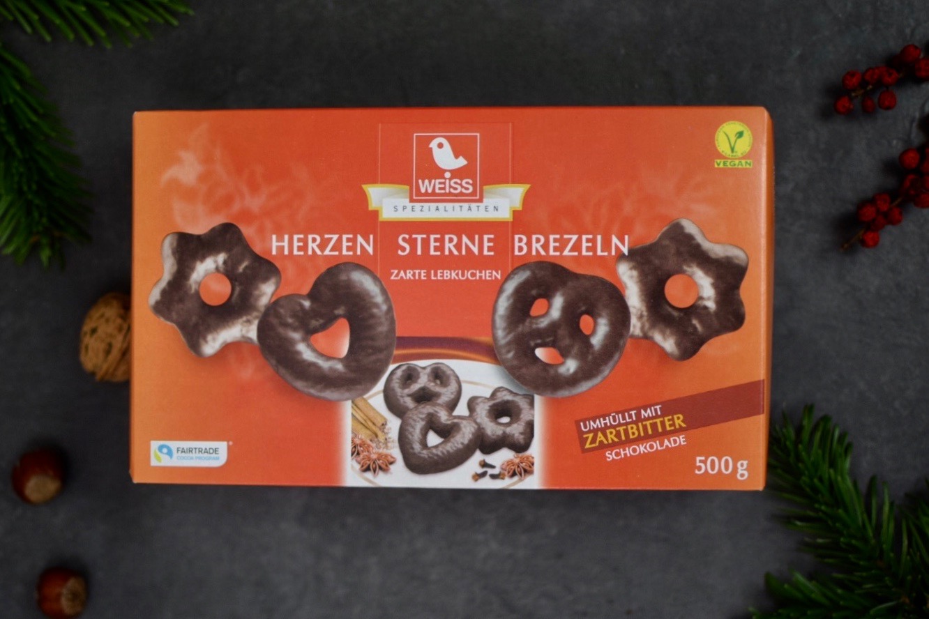 Die altbekannten Lebkuchen von der Firma Weiss gibt es umhüllt mit Zartbitterschokolade in der großen 500g Packung. Spätestens diese sollten Lebkuchenliebhaber überzeugen. Sie schmecken so wie immer, nur sind sie seit einem Jahr ohne Butterreinfett und dürfen sich ebenfalls mit dem V-Label als veganer Lebkuchen identifizieren. Trotz des Kampfpreises von ungefähr 1,69€ verwendet diese Sorte ebenfalls Fairtrade verifizierte Zartbitter Schokolade.