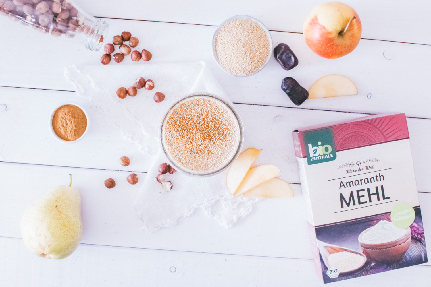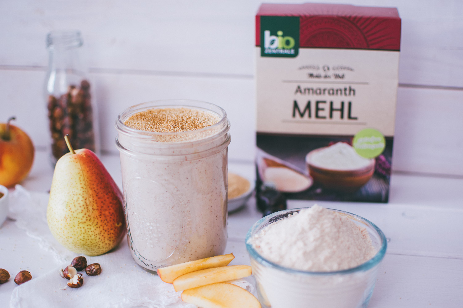 Wir haben uns in letzter Zeit viel mit verschiedenen Weizenmehl-Alternativen beschäftigt und dabei herausgefunden, was die unterschiedlichen Mehle so zu bieten haben. Ihr habt ja mit Sicherheit schon das Rezept für das Kürbiskernbrot gesehen. Brot backen aus Mehl, das erscheint ja irgendwie noch logisch. Aber ein Smoothie mit Mehl als Zutat? Das war neu für mich. Umso interessanter war es auf der Rückseite der Amaranthmehl Verpackung von Biozentrale ein Rezept für einen Amaranth Smoothie zu entdecken.
