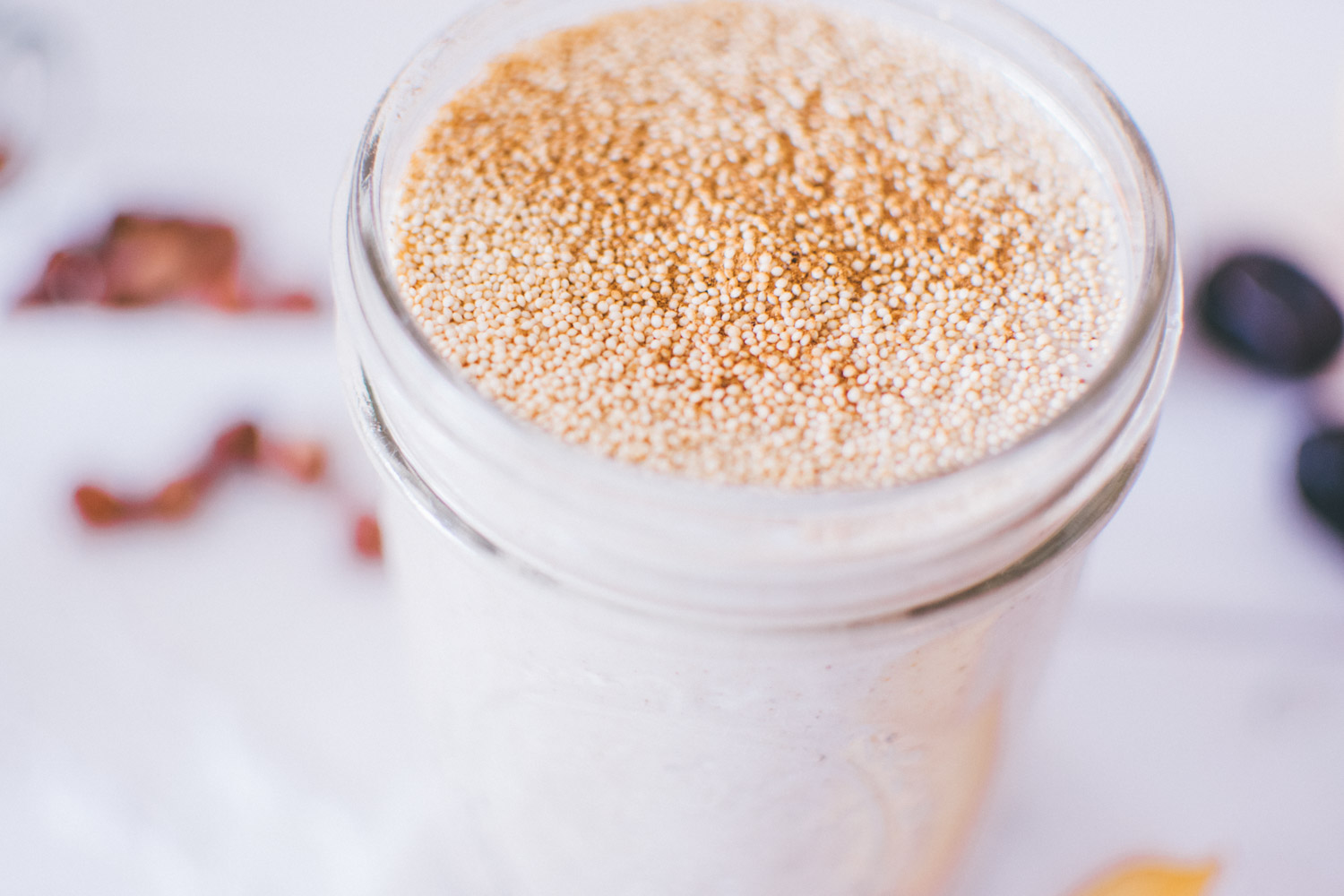 Grüne Smoothies mag nicht jeder. Für alle, die mit Smoothies fast abgeschlossen hatten heißt es jetzt „weiße Amaranth Smoothies„. Das Rezept mit Eiswürfeln kombiniert ist schön erfrischend und eignet sich deshalb ideal für heiße Sommertage. Die Konsistenz ist im Vergleich zu den meisten anderen Smoothies nochmal deutlich cremiger und dadurch ein besonderer Genuss. Und da muss auch keine Banane rein, um es cremiger zu machen. Das wird Bananengegner sicherlich erfreuen. Probiert’s doch einfach am besten selbst mal aus. Übrigens ist dieser vegane Smoothie sehr sättigend und nährstoffreich. Also könnt ihr mit gutem Gewissen genießen und durchaus mal eine Mahlzeit ersetzten.