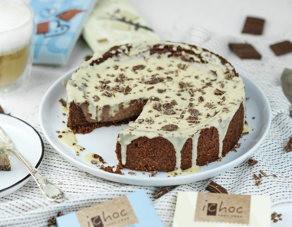 Ein klassischer Käsekuchen ist etwas ganz feines, doch wir lieben Schokolade, deswegen backen wir einen Käsekuchen mit Schokolade. Hierfür verwenden wir die vegane Schokolade Classic und White Vanilla von iChoc. Beide Sorten sind eine super Alternative zu Vollmilch-Schokolade. Sie werden auf Reisdrinkbasis zubereitet und mit einem Hauch von Bourbon-Vanille verfeinert. Passend zum Motto von iChoc: Vegane Genießer sollen nicht länger verzichten! Wir sind auch dieser Meinung und können gar nicht mehr aufhören die leckere vegane Schokolade zu naschen!