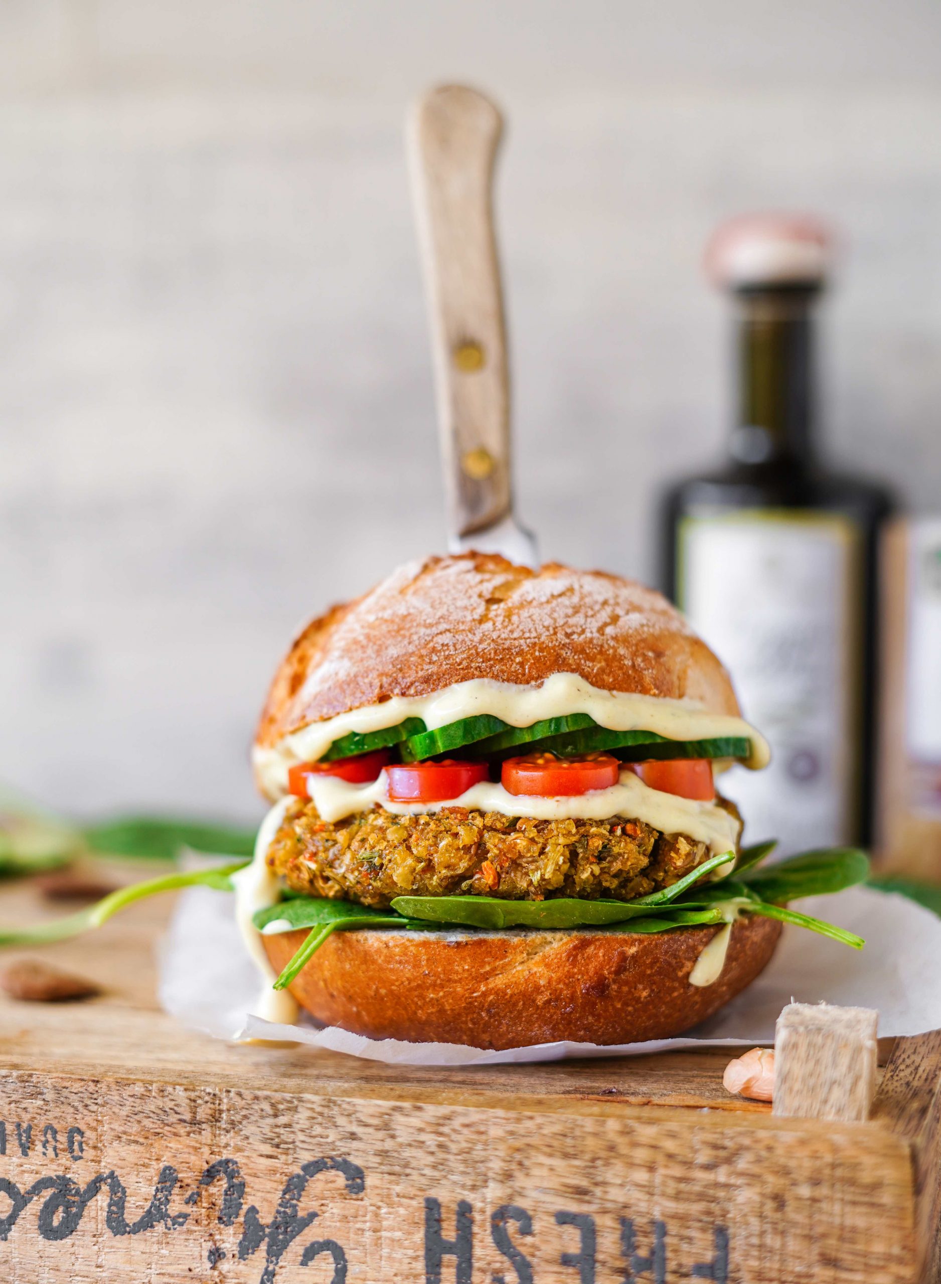 Anschließend den Burger mit Spinat, Patty, Sauce, Tomaten, Gurke und nochmal Sauce belegen.