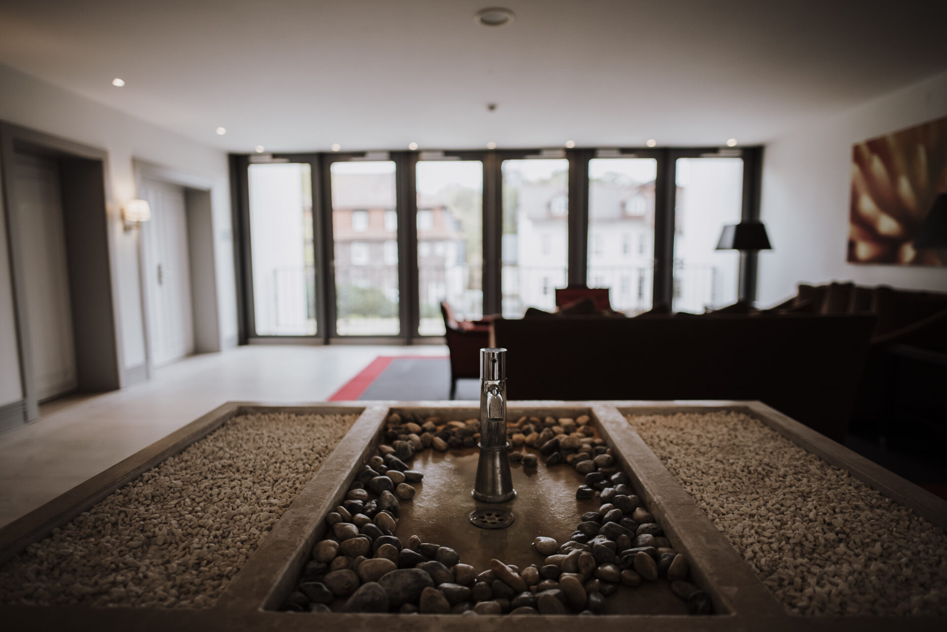 Der Empfang im Hotel war sehr herzlich, höflich und zuvorkommend. Wir fühlten uns sofort wohl. Überall laufen Hotelgäste in Bademäntel herum: Alles ganz entspannt! Unser Zimmer war ebenfalls sehr schön eingerichtet und vor allem mit Baby besonders komfortabel. Natürlich haben wir uns sofort in die Bademäntel geschmissen und sind gleich in die Sauna. Es gibt zwei Sauna Bereiche, schöne Ruheräume und einen beheizten Außenpool. Überall stehen frische Handtücher, eigenes Quellwasser, Obst und verschiedene Tees zur Verfügung. Die gesamte Hotelanlage ist so großzügig angelegt, dass wir uns gut entspannen und zur Ruhe kommen konnten.