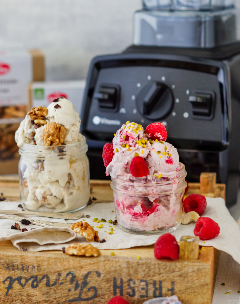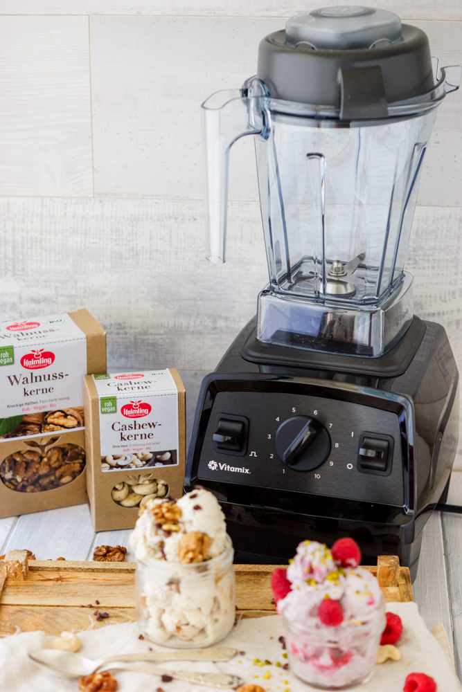 Natürlich benötigst du nicht sofort einen Vitamix, denn du kannst das Eis im Standmixer machen. Wichtig ist hierbei, dass die Cashewkerne über Nacht eingeweicht werden, damit die Eis-Masse schön cremig wird!