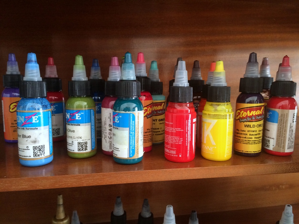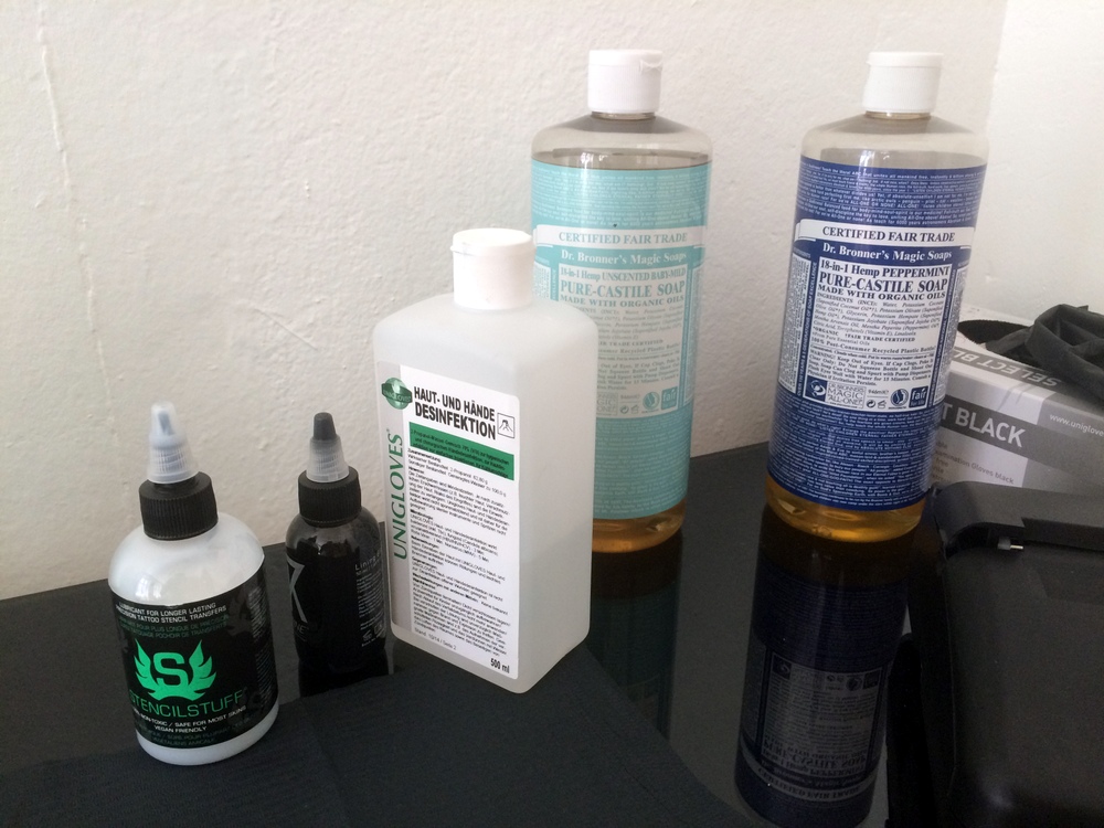 Jede Menge, angefangen von den Farben, die oft Schellack (Blattläuse) enthalten. Die veganen Farben sind qualitativ genauso gut wie die nicht-veganen. Aber auch die Matrize, die man auf die Haut auflegt, um die Linien abzuarbeiten, enthält Gelatine. Die Rasierer besitzen üblicherweise eine Schicht, die tierische Bestandteile enthält, aber auch Klebeband (enthält Wollwachs) oder Vaseline und die ganzen Pflegeprodukte. Wir waren echt erstaunt, in wie vielen Produkten Tierisches enthalten ist. Das war eine Menge Recherchearbeit mit vielen Anfragen bei den Herstellen, bis wir endlich voller Überzeugung sagen konnten: Jetzt ist echt alles vegan!