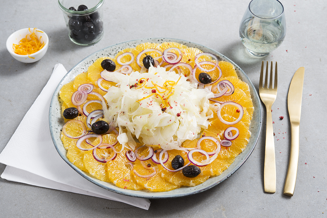 Stunden vor dem Essen die Fenchelknolle fein hobeln, mit Orangensaft vermischen und zudecken.