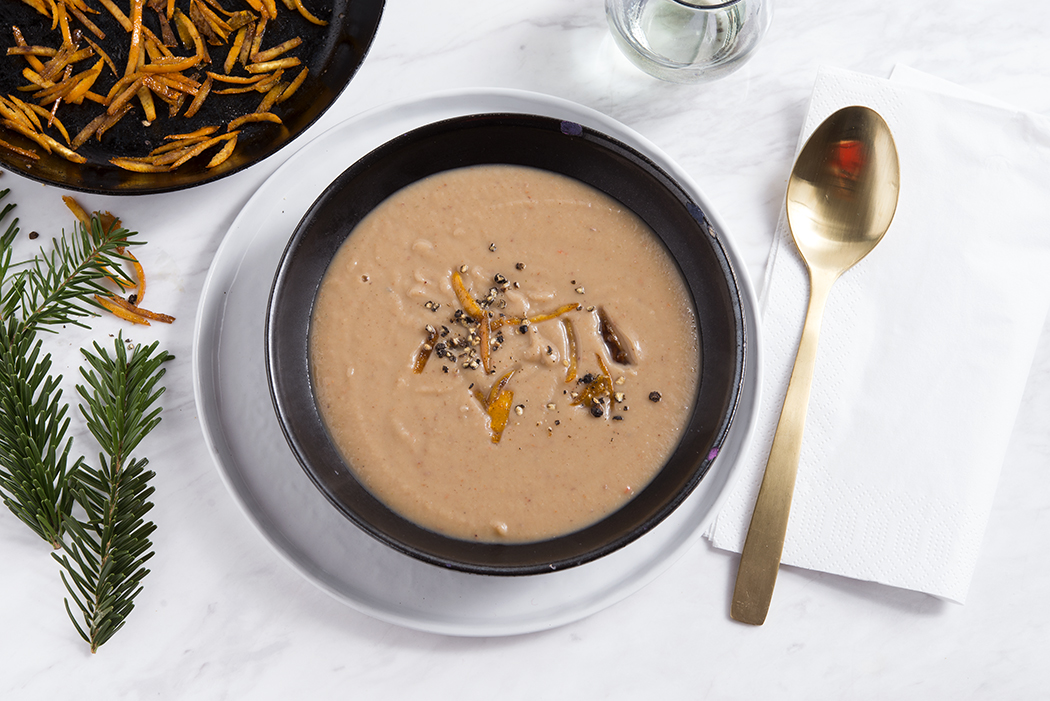 Die Maronensuppe mit Orangenkaramell überzeugt durch ihre innovative Kombination von einem erdigen, süßen Hauch durch die Maronen mit der fruchtigen Frische der Orangen. Abgerundet wird das Ganze durch eine weihnachtliche Würze.