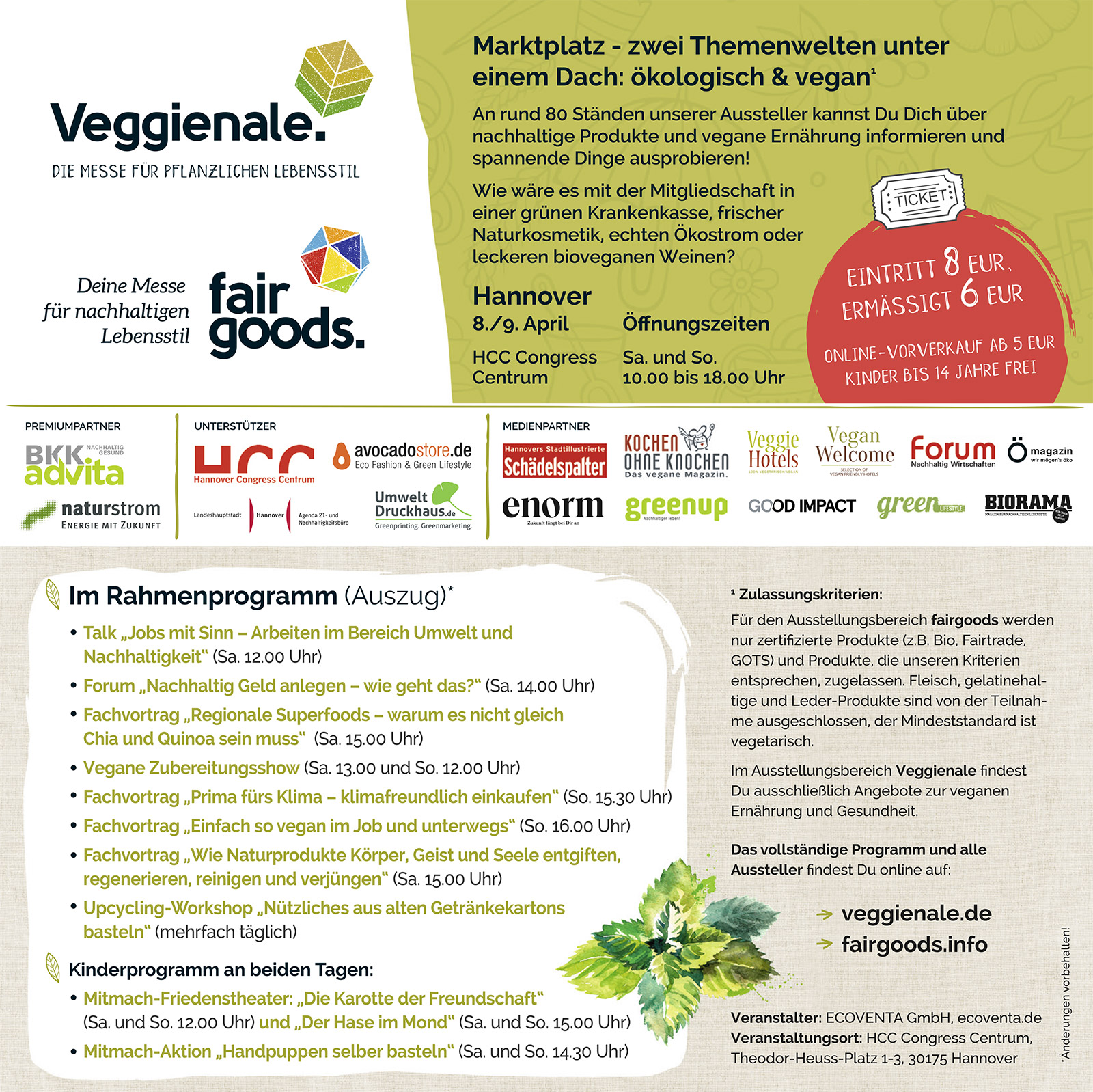 Die Veggienale wird übrigens in Kooperation mit der fairgoods Messe durchgeführt, d.h. dein Eintrittsticket gilt für beide Messen. Die fairgoods Messe ist aber keine vegane Messe, sondern hier ist der Mindeststandard vegetarisch. Fleisch, gelatinehaltige und Lederprodukte sind aber grundsätzlich ausgeschlossen. Ein Besuch auf der Veggienale in Hannover lohnt sich also wirklich! Schau am besten gleich mal auf die Website der Veggienale, dort findest du alle Infos, die du benötigst, natürlich auch die nächsten Messetermine (falls du es nicht nach Hannover schaffst).