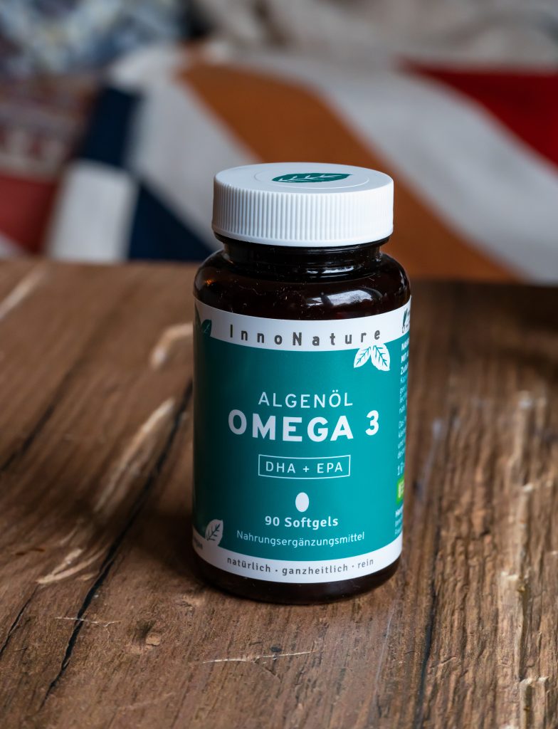 Wie wichtig Omega 3 für unseren Körper ist, wissen wir bereits. Es trägt zu einer normalen Erhaltung der Gehirnfunktion sowie Sehkraft bei. Aber auch zu einer normalen Herzfunktion und ist daher besonders relevant. Omega 3 kommt viel in Fisch vor und zahlreiche Supplemente sind mit Fischöl angereichert, also alles andere als vegan. Bei dem Omega 3 von InnoNature wird hochwertiges Algenöl verwendet, welches sich durch eine hohe Bioverfügbarkeit durch einen hohen DHA- und EPA-Anteil auszeichnet.