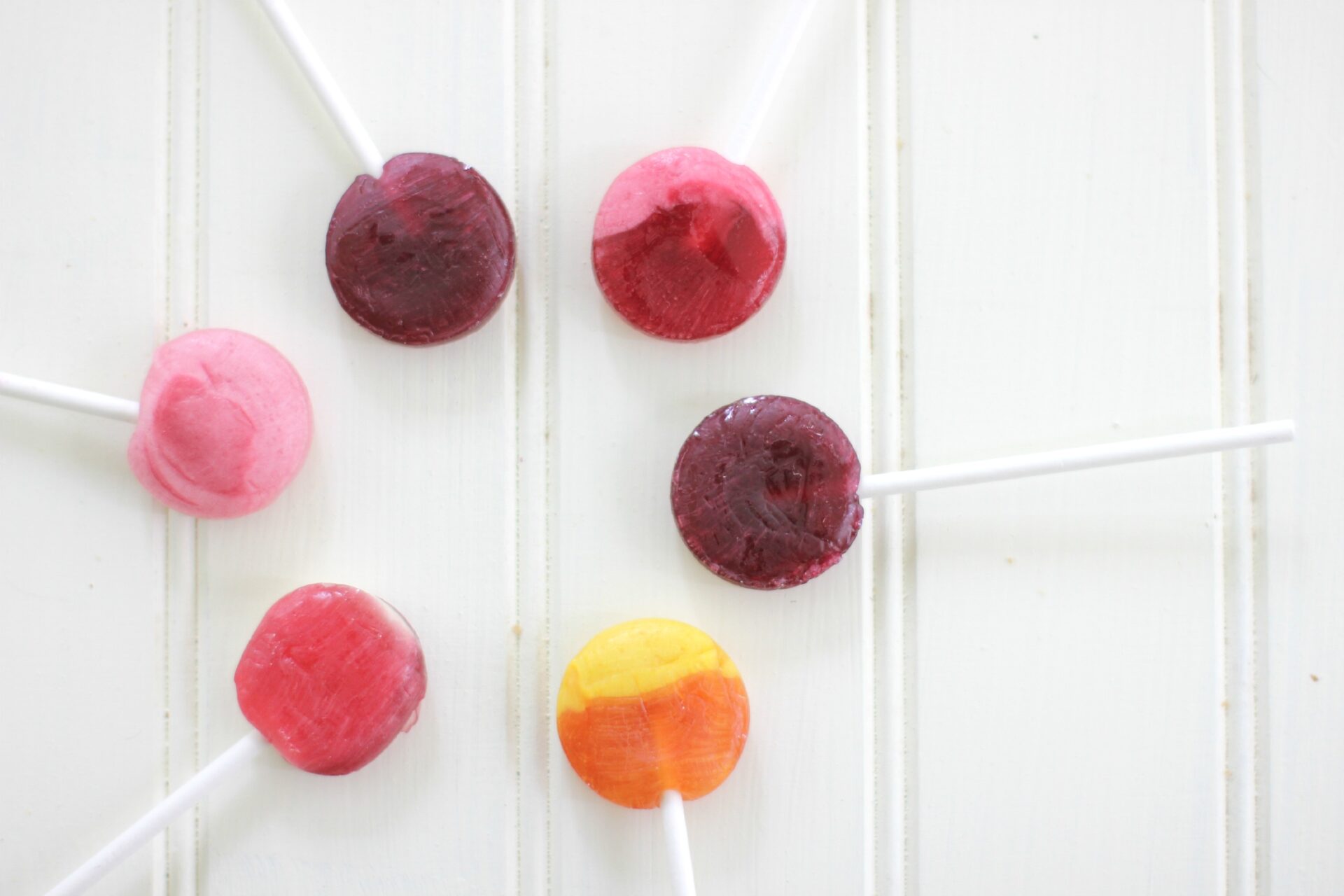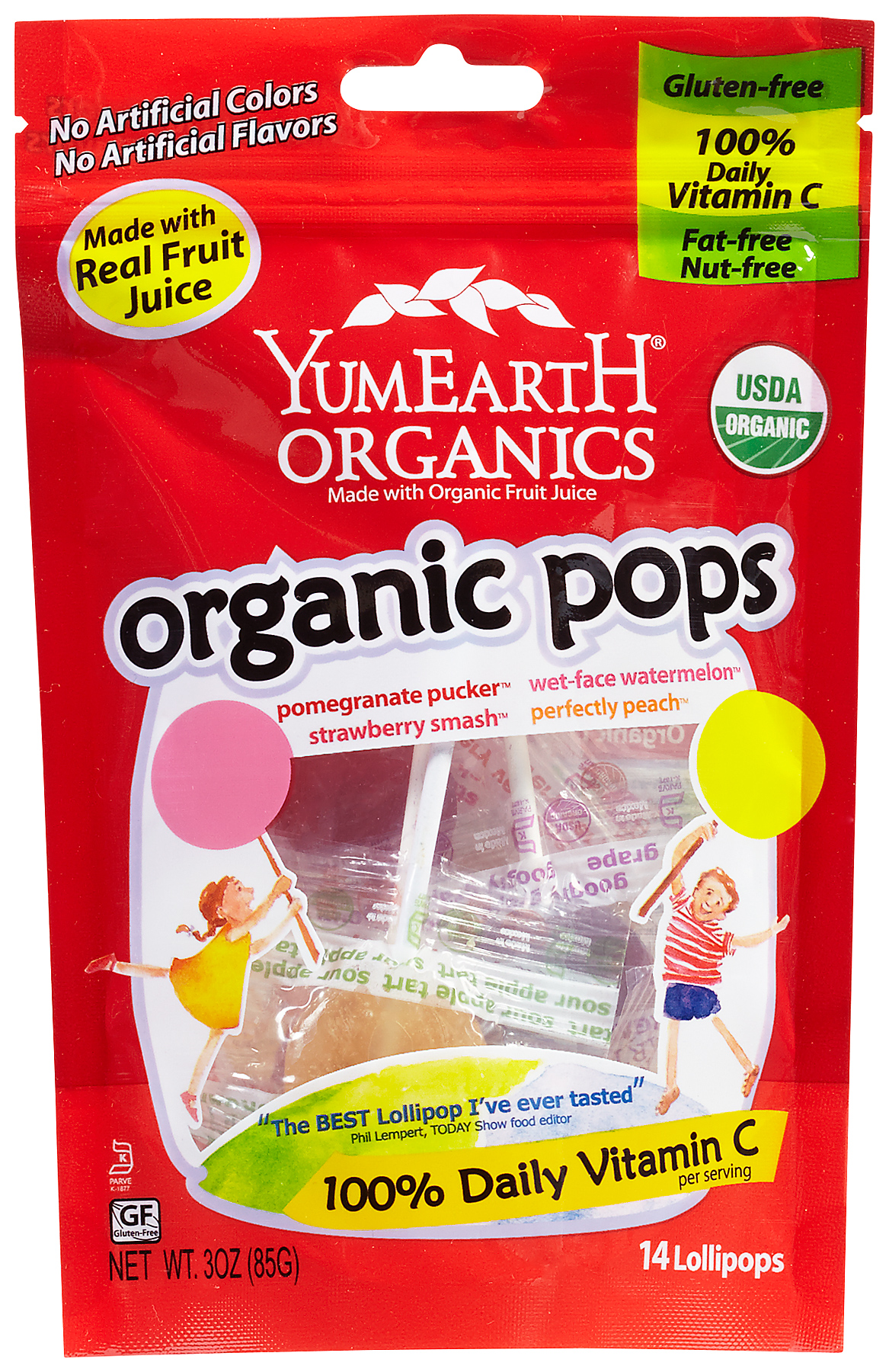 Voran, es sind keine genetisch modifizierten Inhaltsstoffe verwendet worden, denn die Farbe wird aus roten Karotten, schwarzer Johannisbeere, Granatapfel, Grassaft oder Kürbis gewonnen. Anstatt aus künstlichen Farbstoffen werden echte Fruchtsäfte genutzt. Natürlich ist keine Gelatine enthalten, aber auch kein Maissirup mit hohem Fruchtzuckergehalt. Alle Produkte sind ohne künstlichen Süßungsmittel oder Aromen. Sie sind allergenfrei (nussfrei, sojafrei, glutenfrei, vegan). In einem Lollipop ist 100% der empfohlenen täglichen Tagesdosis an Vitamin C und nur 22 Kalorien enthalten!